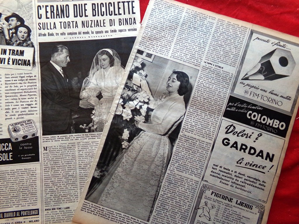 Articolo del 1952 Matrimonio di Alfredo Binda Lina Ambrosetti Varese Biciclette