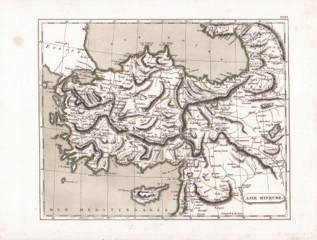 Carta geografica tratta dalla ' Géographie moderne, rédigée sur un nouveau plan, ou Description historique, politique, civile et naturelle des empires, royaumes, Etats et leurs colonies.: renfermant la concordance des principaux points de la géographie ancienne et du moyen âge, avec la géographie modern ' traduzione francese del trattato di Geografia di John Pinkerton, pubblicato a Parigi nel 1804. Le carte geografiche sono elaborate da Jean-Nicolas Buache su quelle disegnate da Aaron Arrowsmith per l’edizione inglese del trattato di Pinkerton. Jean-Nicolas Buache de La Neuville è stato un idrografo e geografo francese attivo tra la fine del XVIII e l'inizio del XIX secolo. Direttore del Dépôt des Cartes de la Marine, fu l'ultimo a fregiarsi del titolo di “primo geografo del re”. Eletto membro dell'Accademia delle Scienze nel 1770, fu incaricato da Luigi XVI di redigere nel 1788 le mappe dei baliati del regno di Francia. J. N. Buache era un ardente sostenitore delle idee cartografiche radicali di suo zio, Phillip Buache, riguardo all'ipotizzata esistenza di un "passaggio a nord-ovest". Come Phillip, Jean Nicholas credeva che la cartografia teorica, cioè l'applicazione delle teorie geografiche, potesse riempire i luoghi vuoti del globo prima che gli esploratori reali vi si recassero. Acquaforte con bellissima coloritura coeva, in ottimo stato di conservazione. Map taken from ' Géographie moderne, rédigée sur un nouveau plan, ou Description historique, politique, civile et naturelle des empires, royaumes, Etats et leurs colonies.: renfermant la concordance des principaux points de la géographie ancienne et du moyen âge, avec la géographie modern ' French translation of John Pinkerton's treatise on Geography, published in Paris in 1804. The maps are elaborated by Jean-Nicolas Buache on those drawn by Aaron Arrowsmith for the English edition of Pinkerton's treatise. Jean-Nicolas Buache de La Neuville was a French hydrographer and geographer active in the late 18th and early 19th centuries. Director of the Dépôt des Cartes de la Marine, he was the last to hold the title "first geographer to the king." Elected a member of the Academy of Sciences in 1770, he was commissioned by Louis XVI to draw up maps of the bailiwicks of the kingdom of France in 1788. J. N. Buache was an ardent supporter of the radical cartographic ideas of his uncle, Phillip Buache, regarding the hypothesized existence of a "northwest passage." Like Phillip, Jean Nicholas believed that theoretical cartography, that is, the application of geographical theories, could fill in the empty places on the globe before actual explorers went there. Etching with beautiful contemporary coloring, in excellent condition. Cfr.