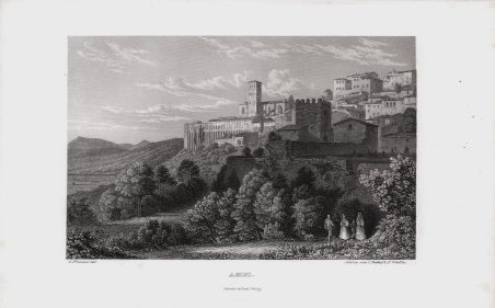 Veduta della città tratta da ' Pittoreskes Italien ' di Carl Frommel, edito a Lipsia nel 1840.Pittore e incisore di Scuola tedesca. Dopo aver visitato l’Italia, si ferma in Germania e diventa professore di pittura e di incisione a Carlsruhe. In seguito, si reca in Inghilterra dove apre un atelier di incisione.Incisione in rame, in ottimo stato di conservazione. View of the city from ' Pittoreskes Italien ' by Carl Frommel, published in Leipzig in 1840. Painter and engraver of the German School. After visiting Italy, he stayed in Germany and became professor of painting and engraving in Carlsruhe. He then went to England where he opened an engraving studio. Copperplate, in excellent condition. Cfr.