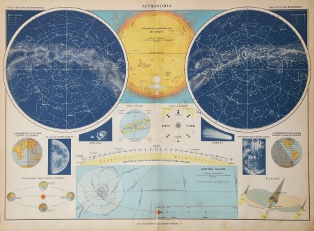 Tavola astronomica tratta dalla rara prima edizione del Grande Atlante Geografico De Agostini, stampata a Novara nel 1922. La Casa editrice De Agostini venne fondata a Roma nel 1901 da Giovanni De Agostini col nome di "Primo Istituto Italiano di Cartografia". Negli anni precedenti alla Prima guerra mondiale, sorse nell'Istituto una vera e propria scuola cartografica nazionale che consentì la creazione di una vastissima gamma di pubblicazioni geografiche, turistiche e didattiche. Tra le tante, vale la pena di ricordare l'Atlante Scolastico Moderno, capostipite di una lunga serie, e il famoso "Calendario Atlante De Agostini", nato nel 1904. Nel 1919, rovinata da una cattiva amministrazione, l'Azienda, che dal 1908 si era trasferita a Novara, fu posta in liquidazione e acquistata in blocco da Marco A. Boroli e Cesare A. Rossi. Per qualche tempo i due nuovi proprietari continuarono ad operare esclusivamente nel settore cartografico, la cui direzione fu affidata al prof. Luigi Visintin. Nel 1922 fu pubblicato il "Grande Atlante Geografico", in assoluto il primo grande atlante italiano. Fotolitografia a colori, minime ossidazioni, per il resto in buono stato di conservazione. Astronomical plate from the rare first edition of the Grande Atlante Geografico De Agostini, printed in Novara in 1922. The De Agostini Publishing House was founded in Rome in 1901 by Giovanni De Agostini under the name "Primo Istituto Italiano di Cartografia." In the years leading up to World War I, a veritable national cartographic school arose at the Institute, enabling the creation of a very wide range of geographical, tourist and educational publications. Among the many, it is worth mentioning the l'Atlante Scolastico Moderno, the progenitor of a long series, and the famous "Calendario Atlante De Agostini", which came into being in 1904. In 1919, ruined by bad administration, the Company, which had moved to Novara since 1908, was put into liquidation and purchased by Marco A. Boroli and Cesare A. Rossi. For some time the two new owners continued to operate exclusively in the cartographic sector, the direction of which was entrusted to Prof. Luigi Visintin. In 1922 the "Grande Atlante Geografico" by far the first major Italian atlas, was published. Color photolithography, minimal oxidation, otherwise in good condition. Cfr.
