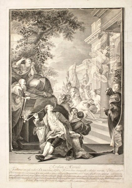 Bella incisione in rame ad acquaforte e bulino eseguita dal soggetto originale di Felice Boscarati, come riportato in lastra "Felix Boscarati Veronensis Pinxit. Joseph Buffetti delineavit" . Tratta dalla celebre serie di quattro dipinti, la cosiddetta Tabula Riveriana, nota per la ricchezza di simbologie di carattere massonico, commissionata da Lazzaro Riviera, uno dei massimi esponenti della massoneria veronese. Rappresentano "la visione di un sistema universale retto dall'arroganza che opprime il genere umano alternando guerra e ricchezza" (Cfr. "Bonaparte a Verona", catalogo della mostra, 1997-1998, Museo di Castelvecchio, pag. 222)<BR>Buon esemplare con minimi strappetti restaurati, rifilato alla battuta del rame.