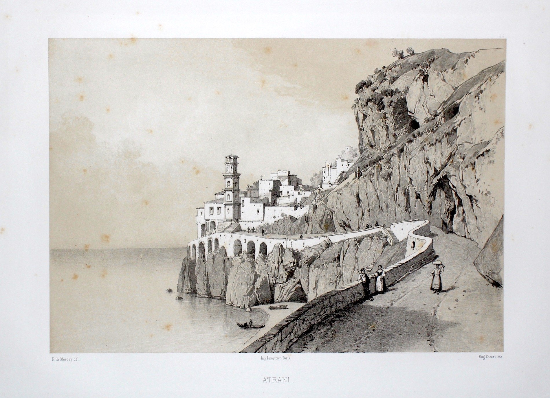 Litografia eseguita su soggetto di F. de Mercey, stampata da Lemercier, 246x355. Bella veduta animata da popolani lungo la strada. Esemplare molto bello, a pieni margini, qualche leggera fioritura.