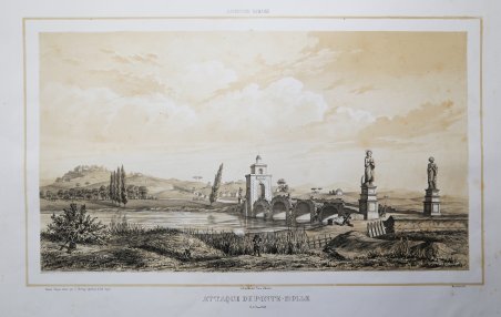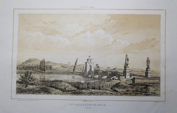 Rara veduta storica di ponte Milvio, del 3 giugno 1849, durante la spedizione francese.Tratta dal monumentale ALBUM DE L'EXPÉDITION ROMAINE, TEXTE ET DESSINS PAR CH. VERTRAY, CAPITAINE D'ETAT-ÉMAJOR. OUVRAGE PUBLIÉ AVEC L'AUTORISATION DE M. LE MINISTRE DE LA GUERRE, di Hugues Charles Antoine Vertray, edita per la prima volta nel 1851. L'opera documenta, attraverso tavole illustrate, la spedizione francese del 1849 Opera rara e monumentale, redatta secondo lo spirito di Bacler di Albe, il celebre generale napoleonico, volta a documentare la spedizione francese del 1849 che si concluse con la vittoria e l'ngresso dei Francesi a Roma con l'insediamento di un governo militare provvisorio, in attesa del ritorno di papa Pio IX, esiliato a Gaeta. Le vedute dell'album furono disegnate sul posto dal capitano Vertray, tradotte in litografie in seppia e nero da Bariau e Montillet, e impresse da Martial Place.Litografia, sporadiche e lievi fipriture lungo i margini esterni, lievissimo alone d'umido nel margine bianco inferiore, nel complesso in ottimo stato di conservazione.Dimensioni del foglio: 622x435 Dimensioni immagine: 492x295 Rara veduta storica di ponte Milvio, del 3 giugno 1849, durante la spedizione francese.Tratta dal monumentale ALBUM DE L'EXPÉDITION ROMAINE, TEXTE ET DESSINS PAR CH. VERTRAY, CAPITAINE D'ETAT-ÉMAJOR. OUVRAGE PUBLIÉ AVEC L'AUTORISATION DE M. LE MINISTRE DE LA GUERRE, di Hugues Charles Antoine Vertray, edita per la prima volta nel 1851. L'opera documenta, attraverso tavole illustrate, la spedizione francese del 1849 Opera rara e monumentale, redatta secondo lo spirito di Bacler di Albe, il celebre generale napoleonico, volta a documentare la spedizione francese del 1849 che si concluse con la vittoria e l'ngresso dei Francesi a Roma con l'insediamento di un governo militare provvisorio, in attesa del ritorno di papa Pio IX, esiliato a Gaeta. Le vedute dell'album furono disegnate sul posto dal capitano Vertray, tradotte in litografie in seppia e nero da Bariau e Montillet, e impresse da Martial Place.Litografia, sporadiche e lievi fipriture lungo i margini esterni, lievissimo alone d'umido nel margine bianco inferiore, nel complesso in ottimo stato di conservazione.Dimensioni del foglio: 622x435 Dimensioni immagine: 492x295 Cfr.