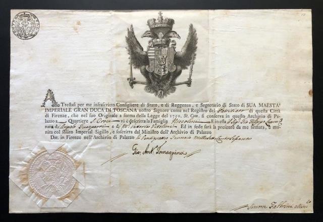 Attestato a stampa inframezzato da compilazione manoscritta che riguarda una “Deputazione sopra la nobiltà e cittadinanza” data in luce a Firenze, nell’Archivio di Palazzo, il 24 Gennaio 1760. Il foglio intero misura cm 43 x 58 ma è ripiegato con una delle due metà lasciata in bianco, la metà utilizzata misura 29 x 43 (una misura abbastanza standard per questo tipo di documenti). Sopra il testo campeggia una raffinata incisione in rame all'acquaforte con lo stemma granducale (è raffigurata un’ aquila bicefala munita di corona, spada e scettro). Nel documento, munito di grande Sigillo Imperiale apposto e integro, si attesta che nel Registro del Patriziato dell'Archivio di Palazzo del Quartiere di Santa Croce in Firenze “vi è descritta la Famiglia Niccolini e in essa il Sig. Gio. Filippo Leone nato di Angiolo Gasparri e di M. Vittoria Vitolini”. Un leggero foxing e alcune normali imperfezioni fisiologiche, stampato su buona carta, ottimo stato di conservazione. Questo tipo di attestato veniva rilasciato dalla “Deputazione sopra la nobiltà e cittadinanza”, l’organo che nella Toscana lorenese certificava o meno la qualifica di nobile o patrizio. Questa certificazione serviva per gli usi in società come l’ammissione a circoli, accademie, privilegi per censo, facilitazioni varie etc. Nel Granducato di Toscana, a partire dal 1750, il “riconoscimento della nobiltà e della cittadinanza” divenne oggetto di una precisa procedura regolamentata con una legge che fu appunto quella “per il regolamento della nobiltà e cittadinanza” (promulgata a Vienna il 31 luglio e a Firenze il primo ottobre del 1750). A tale procedura sovrintendeva la “Deputazione sopra la nobiltà e cittadinanza” che, proposta da Richecourt in un suo dispaccio al Granduca del febbraio 1749, fu effettivamente istituita nel contesto della legge del 1750. L’operato della Deputazione consisteva nell'esaminare le domande d’iscrizione, nel verificare le relative “provanze” e nel decidere di ammettere o meno al giudizio del Granduca, finale e insindacabile, le richieste presentate. Così, un dossier standard conteneva la dichiarazione in cui il capo famiglia esponeva il desiderio di far descrivere la propria casata enumerando i componenti che sarebbero stati interessati all’operazione; e conteneva il disegno delle armi della famiglia, (con relativa descrizione araldica e l'indicazione dei luoghi in cui erano visibili), l'albero genealogico (corredato di documentazione comprovante, ricavata dall'archivio della Decima), estratti di battesimo o, in sostituzione, dichiarazioni d'età, dichiarazioni di dote. Nel corso di un tale procedimento si produceva e si accumulava la documentazione che, nel sedimentarsi, ha prodotto l'Archivio della Deputazione, a testimonianza di una attività che (salvo la breve interruzione del periodo francese del 1808 - 1814) proseguì fino all'Unità d'Italia (per Firenze, ad esempio, le ultime iscrizioni nei registri sono relative al 1847 per il patriziato con la famiglia del principe Poniatowschi; e al 1860 per la nobiltà, dove, fra le ultime iscrizioni, di particolare interesse è quella del conte Benso di Cavour). .