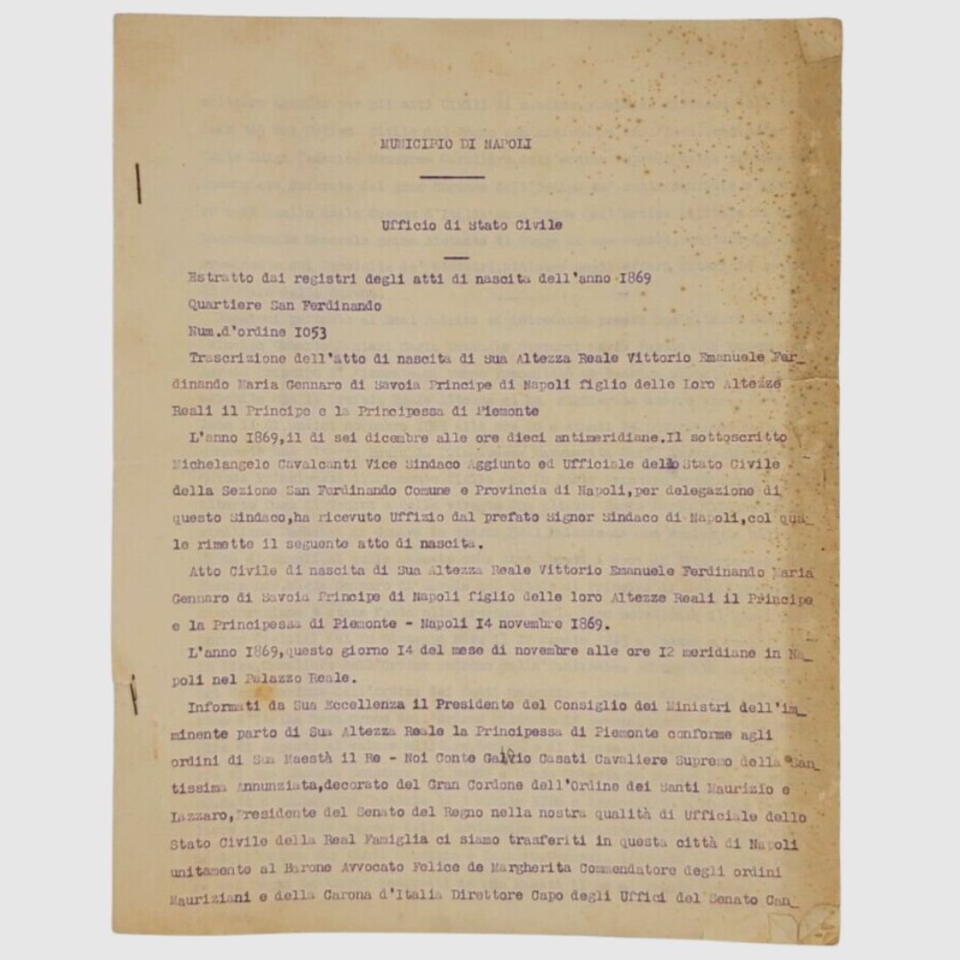 Atto di nascita di Vittorio Emanuele Ferdinando Maria Gennaro di Savoia principe di Napoli.
