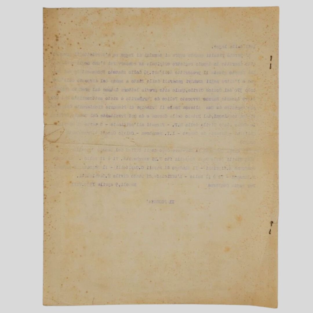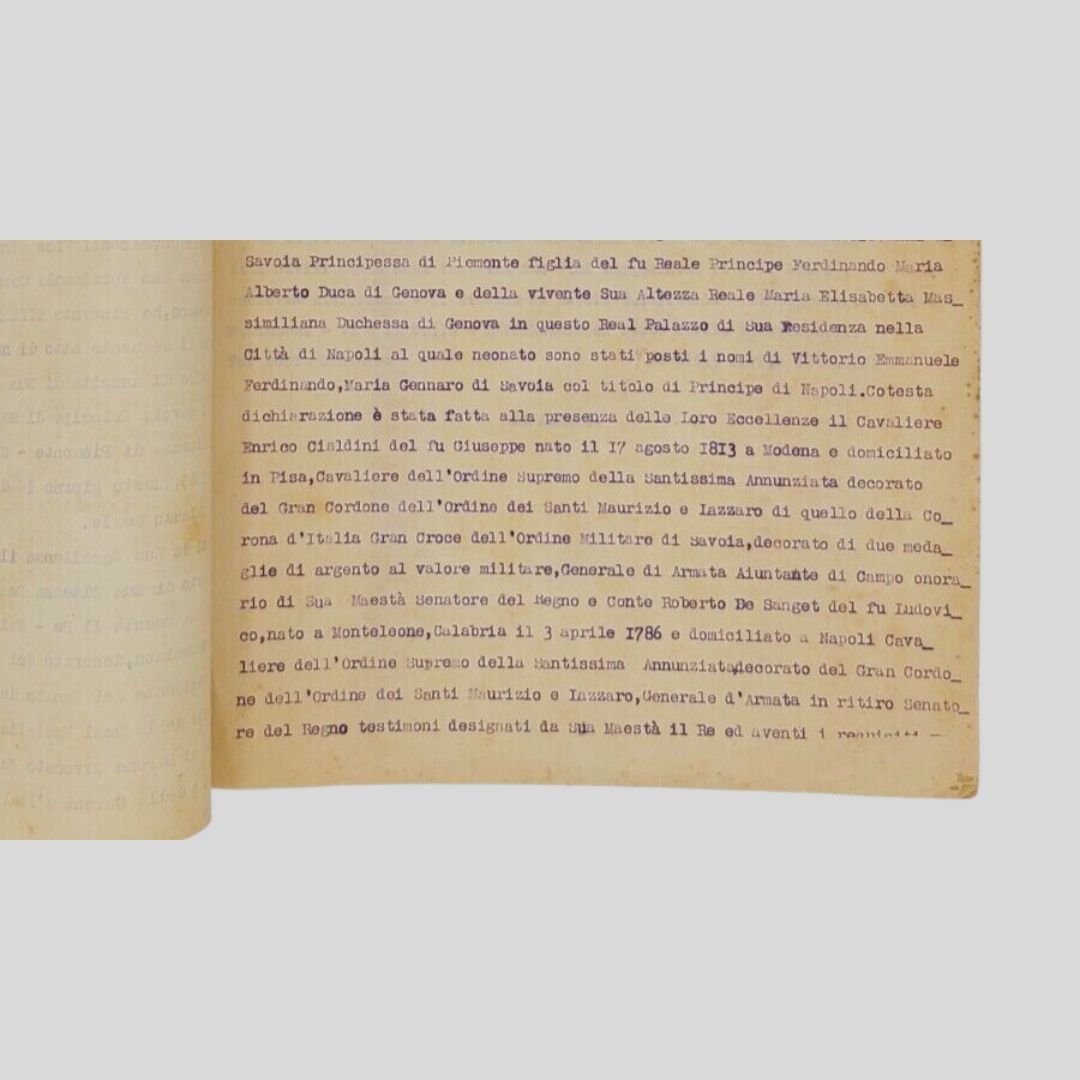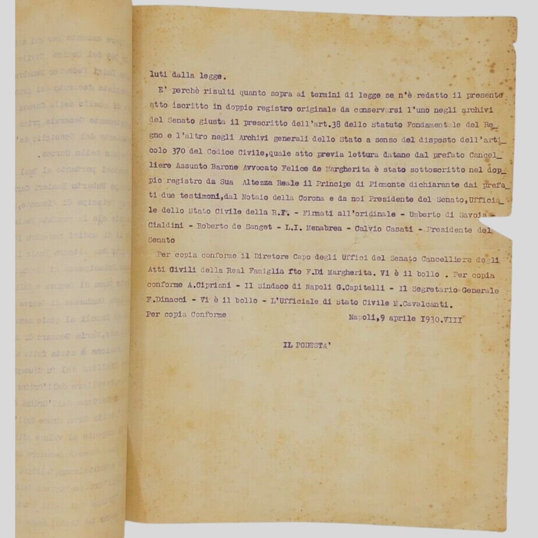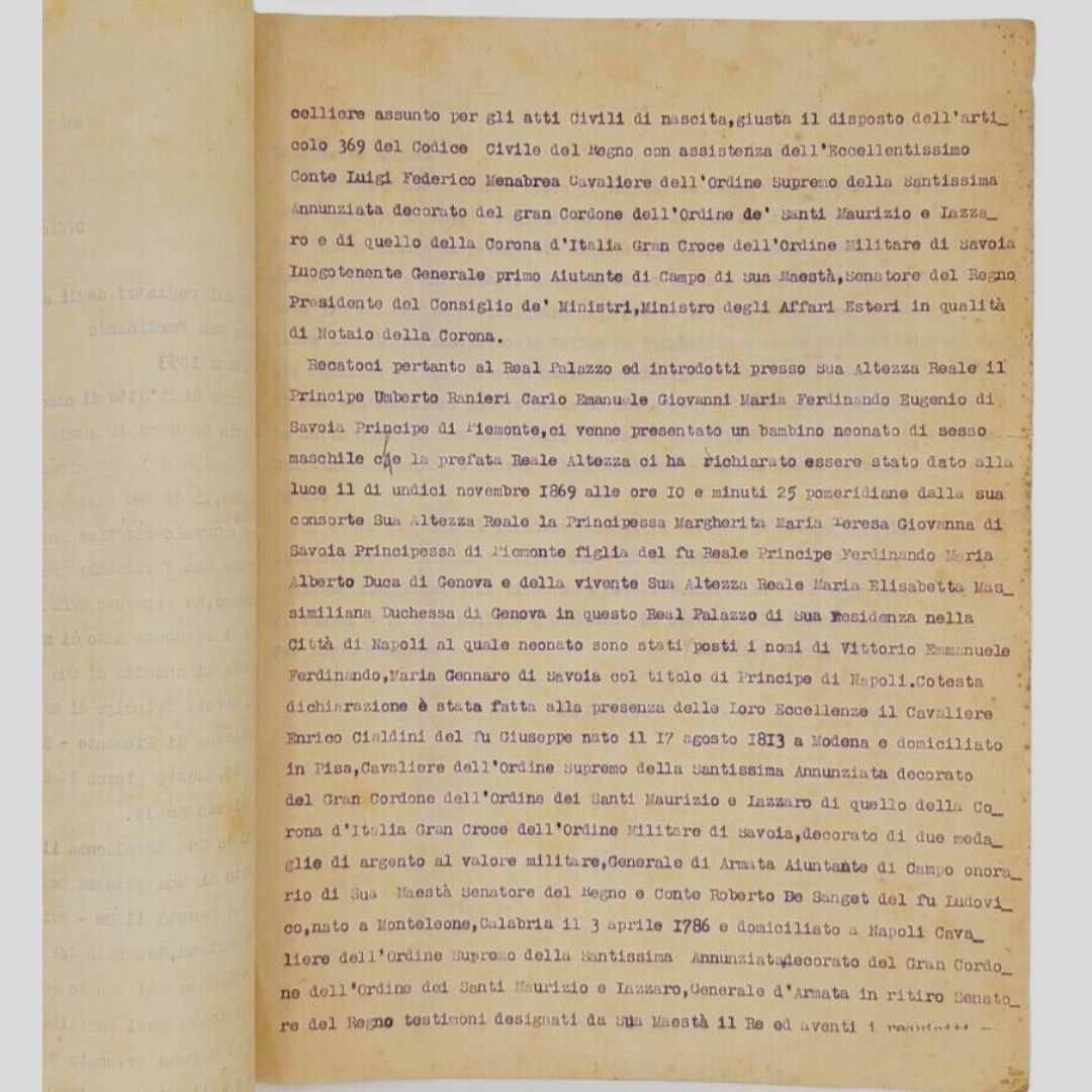 Municipio di Napoli. Ufficio di Stato Civile. Per copia Conforme, Napoli 9 aprile 1930. Tre fogli dattiloscritti solo al recto e spillati, cm 23×29. Insignificanti strappetti, piegoline, tracce di foxing e due parole non impresse a sufficienza a p. 2 [requisiti vo-]. Non comune. Alla stipula dell’atto originario (14 novembre 1869) erano presenti oltre a Umberto I, il Presidente del Senato Gabrio Casati, il direttore degli Uffici del Senato avv. Felice de Margherita, il neo Presidente del Consiglio Luigi Federico Menabrea, Enrico Cialdini, il senatore Roberto de Sanget.