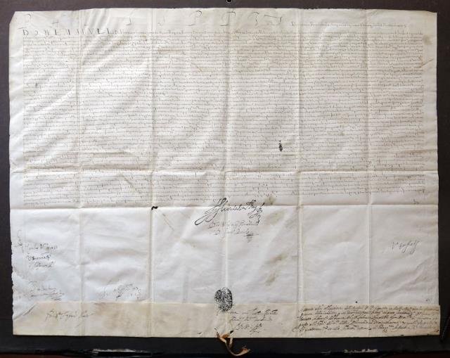 Datato 1634 (ultimo rigo) ma 1694 (verso). Manoscritto su pergamena a inchiostro bruno di medie dimensioni in unico foglio, cm 51,5 x 62 circa, scrittura latina e spagnola (mercantile o cancelleresca?) con abbreviazioni, al verso sono presenti nomi, notazioni e la data del 1694. Redatto sotto il governo di Filippo IV d’Asburgo e a nome Don Emanuel di Zuniga e Fonseca, Conte di Monterey e di Fuentes, è quasi certamente riferibile all’attribuzione di partizioni territoriali, come probabile per questa tipologia di documenti. Privo di ceralacca, usuali pieghe di chiusura, molto buono lo stato di conservazione. Don Emanuel di Zuniga e Fonseca viene citato nel “Trattato del Monte Vesuvio e de’ suoi incendi” di Gianbernardino Giuliani. Come si evince tra la fine della pagina 62 e l’inizio della pagina 63 di suddetto trattato, tra l’altro raro e interessantissimo per l’argomento affrontato, all’epoca era Pontefice Urbano Ottavo, Imperatore era Ferdinando D’Austria, e il Regno era quello di Filippo IV (alle due pagine citate si legge che nel giorno del 16 dicembre 1631 ci fu il terremoto del Vesuvio, eruzione che procurò più di quattromila vittime in quello che fu l’evento più violento e distruttivo della sua storia recente (l’eruzione si verificò dopo un periodo di quiescenza durato circa cinque secoli). Filippo IV d'Asburgo detto anche Filippo il Grande, (Spagna, Valladolid, 1605 – Madrid, 1665), fu re di Spagna dal 1621 fino alla morte, sovrano dei Paesi Bassi spagnoli nonché re del Portogallo e di Algarve come Filippo III fino al 1640. .