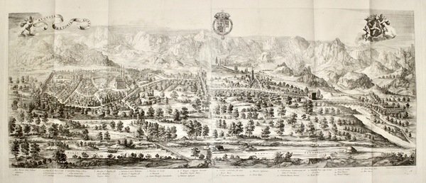 Incisione in rame di mm 465x1160. Tratta da "Theatrum Sabaudiae", opera fortemente voluta da Carlo Emanuele III, e stampata originariamente nel 1682 ad Amsterdam, presso la tipografia Blaeu. Attorno al 1715 l'opera fu ristampata da Pierre Mortier. Si tratta di una raccolta di splendide immagini di dimore, santuari, luoghi di svago della famiglia sabauda e città del regno, che intende porsi come manifesto politico del duca di Savoia, per far conoscere alla comunità e alle corti europee il livello raggiunto dai suoi possedimenti. Bella veduta della città, con il fiume Dora e la campagna in primo piano e i monti sullo sfondo. In alto da sinistra cartiglio con titolo, stemma sabaudo, e stemma cittadino; in basso legenda con rimandi numerati. Ottimo esemplare, con ampi margini. Pieghe editoriali, rinforzo alla giuntura dei fogli.