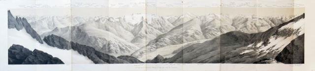 Berna, Lit. F. Lips, 1870 circa. Tonolitografia, cm 22,3 x 96,3 (il foglio). Studer, G. Dis. & F. Lips Lith. Il Piz Cavardiras è un monte svizzero nelle Alpi di Glarona. Lunga veduta del complesso delle Alpi Glaronesi, per lo più presenti nel Canton Glarona, ma comprendenti anche il Canton Ticino e la Valtellina. Buono stato.
