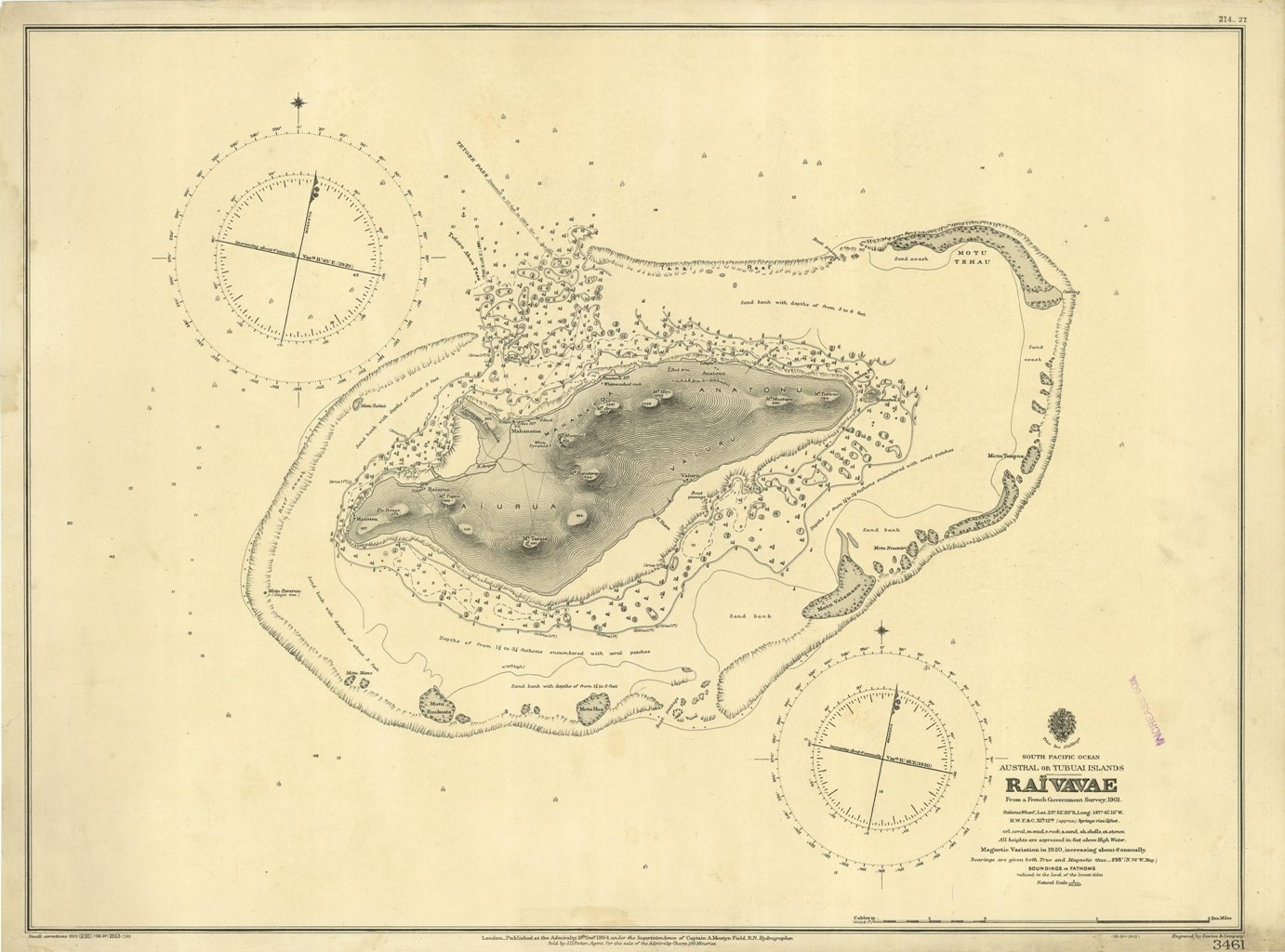 Austral or Tubuai Islands - Raivavae From a French Government Survey, 1901. London Published at the Admiralty 19th Dec. 1904, under the Superintendence of Captain A. Mostyn Field, Hydrographer. Small corrections: 1923. Autore: Admiralty Charts. Luogo: Austral or Tubuai Islands - Polynesia. Anno: '900. Tecnica: incisione. Dimensioni: 482x652 mm