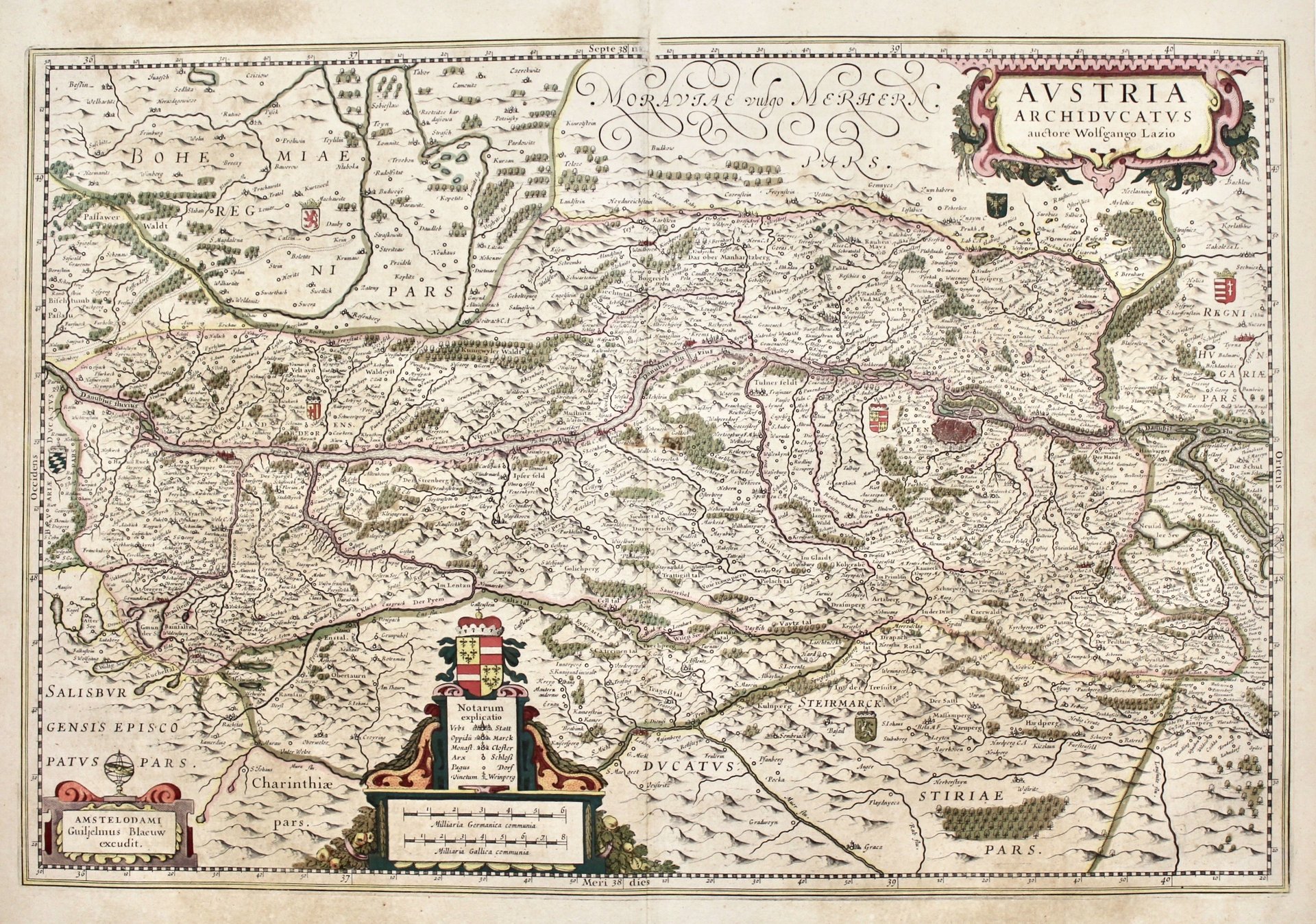 Incisione in rame, colorata d’epoca, mm 370x550, testo latino al verso. Elegante e piacevole carta, tratta da Atlas Novus, arricchita da bei cartigli. Buon esemplare con leggero ingiallimento della carta e piccolo difetto in alto alla piega centrale. W. Blaeu, astronomo allievo di Tycho Brahe, fondò un’officina per la costruzione di globi nel 1599; quasi immediatamente iniziò a pubblicare anche carte geografiche, giungendo nel 1630 alla creazione del primo atlante “Atlantis Appendix” e cinque anni dopo, della prima edizione in due tomi del “Atlas Novus”. Dopo la sua morte nel 1638, a cura del figlio Johan si giunse nel 1662 alla pubblicazione del celebre “Atlas Maior” in 11 volumi. Nel 1672 un incendio distrusse l’officina e segnò la fine dell’attività.