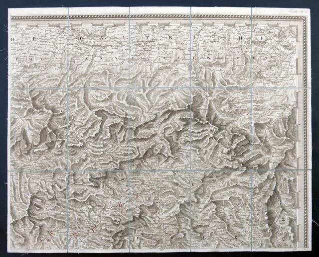 Dalla “Carta Amministrativa del Regno d’Italia co' suoi stabilimenti politici, militari, civili e religiosi e con una parte degli stati limitrofi. Costrutta nel Deposito della Guerra per ordine del Ministro della Guerra e Marina nell'anno MDCCCXI, aggiunta e corretta nell'anno 1813”, edita a Milano nel 1813 (una grande carta composta da più fogli quadrettati e applicati su tela d'epoca, ciascuno di cm 54 x 67 circa per un perimetro totale di cm 1400 x 1100 circa), carta dell'Austria che si estende in direzione ovest – est fino a comprendere le città di Wien, Baden, Neustadtd ecc. La carta è composta da un foglio, numerato come foglio V sulla parte incisa, e con il numero 5 al retro della tela. Benedetto e Gaudenzio Bordiga furono incisori e cartografi, originari della Valsesia e attivi a Milano nella prima metà del XIX secolo, un periodo caratterizzato da alterne vicende storico politiche, in cui realizzarono un discreto corpus incisorio. L'opera più importante cui contribuirono fu la “Carte générale du Théâtre de la Guerre en Italie”, una grande carta commissionata, nel 1797 dallo Stato Maggiore dell'Armata Francese di Napoleone, al capo battaglione Bacler d'Albe, capo del Gabinetto Cartografico Francese: la carta, celebrativa della prima campagna d'Italia, fu in gran parte realizzata a partire da carte preesistenti, fu realizzata in cinquantaquattro fogli sotto la direzione di Giacomo Pinchetti e fu appunto incisa dai fratelli Benedetto (1800 - 1834) e Gaudenzio Bordiga. Gaudenzio Bordiga (Camasco, Varallo, 10 febbraio 1773 – Milano, 18 gennaio 1837), seguì a Varallo studi letterari e di disegno. Stabilitosi a Milano con il fratello Benedetto, fu capo incisore dell'Istituto Geografico Militare e mantenne tale carica anche dopo l'occupazione austriaca. Senza la collaborazione del fratello Benedetto, Gaudenzio disegnò, e a volte incise, varie carte geografiche militari (“Carta delle stazioni militari in Italia”, 1804; “Carta militare del Regno d'Etruria e del principato di Lucca”, 1806) e scrisse opere di erudizione storico – artistica (“Notizie intorno alle opere di Gaudenzio Ferrari, pittore e plasticatore”, Milano, G. Pirotta, 1821; “Storia e guida del Sacro Monte di Varallo“, Varallo, 1830). Molto buono lo stato di conservazione.