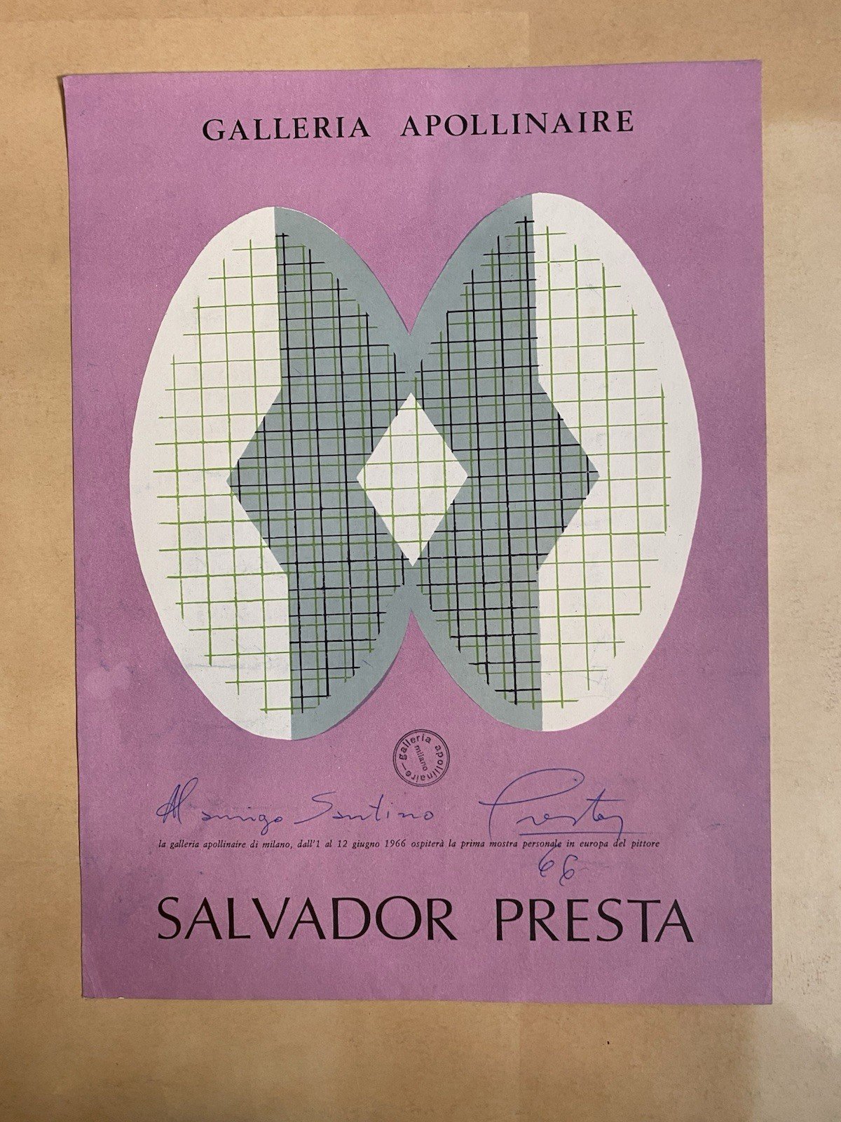 Autografato Presta Salvador Manifesto 44 x 32 cm. Galleria Apollinaire 1966