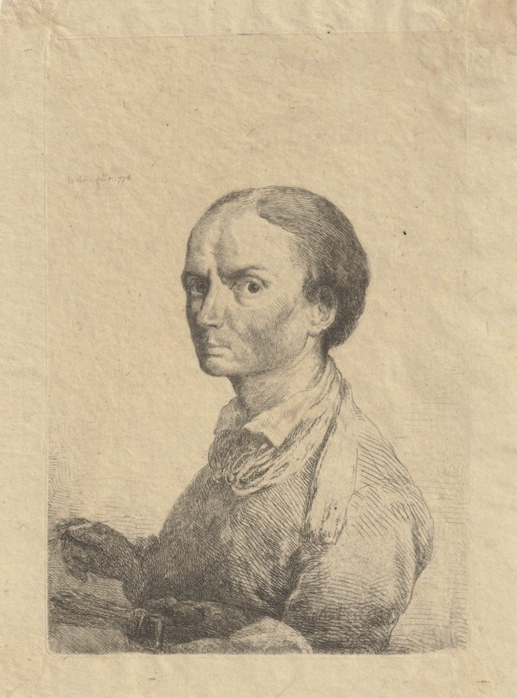 Nel foglio l'artista si mostra all'osservatore guardandolo negli occhi. Rappresenta se stesso a mezzo busto rivolto a sinistra, con la mano destra regge uno pennello mentre nella sinistra una tavolozza e altri strumenti di lavoro. La fronte corrugata e gli occhi fissi caratterizzano il volto, l'espressione concentrata e seria rivela un artista sicuro del suo ruolo sociale. La figura è costruita per tratti brevi e paralleli, fitti, raramente incrociati che disegnano la morbidezza dell'abito e le sfumature del grigio. Pur nell'assenza di un marcato chiaroscuro la figura si stacca dal fondo lasciato privo di descrizione. In alto a sinistra firma e data: Norblin 1778. Impressione nitida su carta leggera color avorio. Ottimo stato di conservazione. Esemplare nel II/II stato con la firma e la lavorazione a bulino.