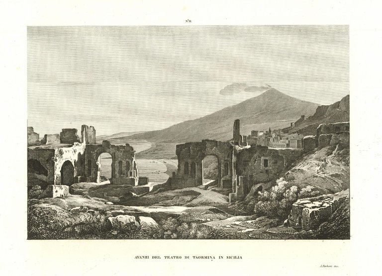Stampa antica originale, raffigurante una veduta dei resti del teatro di Taormina, sullo sfondo l'Etna