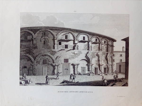 Incisione originale in formato cm.30,5x44,5, raffigurante l'esterno dell'anfiteatro romano di Lucca con alcuni personaggi. > Bedini / Fanelli, 257, "La veduta ricalca quella di Antonio Terreni con varianti minime informate ad un gusto più pittorico (ombre, cielo, strutture e paramenti murari). Anche le figure indulgono a effetti teatrali". Codice libreria 141739.