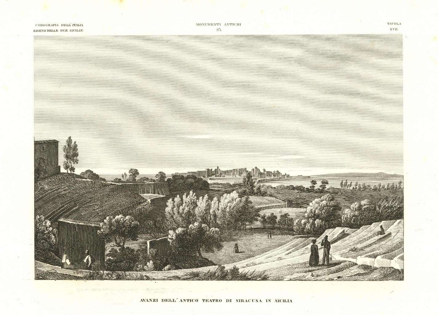 Veduta dei resti dell'anfiteatro, sullo sfondo Siracusa. Stampa antica originale