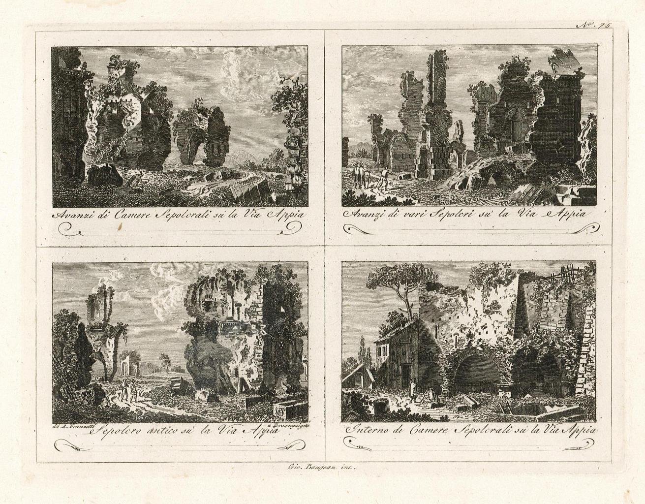 Stampa, antica ed originale, con quattro piccole vedute incise a bulino, caratterizzate da un segno piuttosto incisivo con forti chiaroscuri. Autore: Baugean inc. Luogo: Roma. Anno: 1820 ca. Tecnica: incisione a bulino. Dimensioni: mm 220x270 ca il foglio.