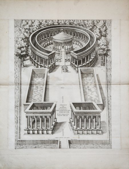 Bulino, 1558, titolato, firmato e datato in lastra in basso al centro ORNITHON / Siue / AVIARIVM / M. VARRONIS / PYRRO. LIGORIO. NEAP. INVE. / ROMAE M. D. L. V. III. / Michaelis Tramezini formis / Cum priuile. Summi pont. Riproduce l’uccelliera nella villa di Cassino di Marco Terenzio Varrone. Da un soggetto di Pirro Ligorio. Esemplare nell’unico stato conosciuto, stampato dalla tipografia di Michele Tramezzino. Come sostiene Alessia Alberti “probabilmente la matrice non apparteneva a Lafrery dal momento che né risulta tra i beni ceduti da S. Duchet a P. Graziani, né doveva essere toccata a C. Duchet, che ne fece eseguire una copia da Ambrogio Brambilla nel 1581”. Magnifica prova, impressa su carta vergata coeva con filigrana “stella a sei punte in una losanga iscritta in un cerchio” (cfr. Woodward nn. 289-290), rifilata al rame e con margini coevi aggiunti, in ottimo stato di conservazione. “Pirro Logorio fu architetto, pittore, antiquario, studioso e scrittore d’arte che si appassionò all’archeologia mentre a Tivoli, durante i lavori alla villa estense commissionatagli dal cardinale Ippolito II d’Este, contemporaneamente dirigeva gli scavi di Villa Adriana. L’esperienza maturata a Tivoli gli fornì l’occasione per il trattato sulle Antichità di Roma, edito nel 1553. In questa stampa Ligorio mette in immagini l’uccelliera (in greco ornithon, in latino aviarium) che M.T. Varrone possedeva a Casinum (oggi Cassino) e che lui stesso descrive minutamente nel libro terzo del De Re Rustica (da cui la stampa riprende termini e misure). Varrone (116-27 a.C.) iniziò un nuovo costume nei confronti degli animali considerandoli, non più soltanto come destinati alla tavola, bensì come decoro di ville dove intrattenere i propri ospiti. La sua puntigliosa distinzione tra uccelliere in vista di profitto o, invece, di svago e di contemplazione, ha fatto pensare però che con le seconde egli voglia tratteggiare il suo ideale di vita civica e con le prime voglia invece fustigare la decadenza della vita pubblica negli ultimi decenni della Roma repubblicana. Nella stampa, dove dell’uccelliera piuttosto si notano le reti che nella villa cassinese di Varrone tenevano in cattività gli uccelli, Pirro Ligorio ha solo un interesse antiquario, documentario e archeologico” (cfr. Marigliani, ' Lo splendore di Roma nell’Arte incisoria del Cinquecento). L’opera appartiene allo ' Speculum Romanae Magnificentiae, la prima iconografia della Roma antica. ' Lo ' Speculum ' ebbe origine nelle attività editoriali di Antonio Salamanca e Antonio Lafreri (Lafrery). Durante la loro carriera editoriale romana, i due editori - che hanno lavorato insieme tra il 1553 e il 1563 - hanno avviato la produzione di stampe di architettura, statuaria e vedutistica della città legate alla Roma antica e moderna. Le stampe potevano essere acquistate individualmente da turisti e collezionisti, ma venivano anche acquistate in gruppi più grandi che erano spesso legati insieme in un album. Nel 1573, Lafreri commissionò a questo scopo un frontespizio, dove compare per la prima volta il titolo Speculum Romanae Magnificentiae. Alla morte di Lafreri, due terzi delle lastre di rame esistenti andarono alla famiglia Duchetti (Claudio e Stefano), mentre un altro terzo fu distribuito tra diversi editori. Claudio Duchetti continuò l’attività editoriale, implementando le lastre dello Speculum con copie di quelle “perdute” nella divisione ereditaria, che fece incidere al milanese Amborgio Brambilla. Alla morte di Claudio (1585) le lastre furono cedute – dopo un breve periodo di pubblicazione degli eredi, in particolare nella figura di Giacomo Gherardi - a Giovanni Orlandi, che nel 1614 vendette la sua tipografia al fiammingo Hendrick van Schoel. Stefano Duchetti, al contrario, cedette le proprie matrici all’editore Paolo Graziani, che si associò con Pietro de Nobili; il fondo confluì nella tipografia De Rossi passando per le mani. Engraving, 1558, titled, signed and dated in plate in lower center ORNITHON / Siue / AVIARIVM / M. VARRONIS / PYRRO. LIGORIO. NEAP. INVE. / ROMAE M. D. L. V. III. / Michaelis Tramezini formis / Cum priuile. Summi pont. Reproducing the aviary in the Cassino villa of Marcus Terentius Varro. After a subject by Pirro Ligorio. Example in the only known state, printed by Michele Tramezzino. As Alessia Alberti suggest, the plate probably did not belong to Lafrery since neither does it appear among the possessions given by S. Duchet to P. Graziani, nor should it have belonged to C. Duchet, who had a copy made by Ambrogio Brambilla in 1581. Magnificent proof, printed on contemporary laid paper with watermark "six-pointed star in a lozenge inscribed in a circle" (cf. Woodward nos. 289-290), trimmed to copperplate and with contemporary margins added, in excellent condition. “Pirro Logorio was an architect, painter, antiquarian, art scholar and writer who became interested in archaeology while in Tivoli, while working on the Este villa commissioned by Cardinal Ippolito II d'Este, at the same time directing excavations at Villa Adriana. His experience at Tivoli provided him with the occasion for his treatise on the Antiquities of Rome, published in 1553. In this print Ligorio pictures the aviary (in Greek ornithon, in Latin aviarium) that M.T. Varro possessed at Casinum (now Cassino) and which he himself describes minutely in the third book of De Re Rustica (from which the print takes terms and measurements). Varro (116-27 B.C.E.) initiated a new custom toward animals by considering them, no longer merely as intended for the table, but as decorations of villas in which to entertain his guests. His punctilious distinction between aviaries with a view to profit or, on the other hand, to leisure and contemplation, however, has suggested that with the latter he wants to sketch his ideal of civic life and with the former he wants instead to flog the decadence of public life in the last deca