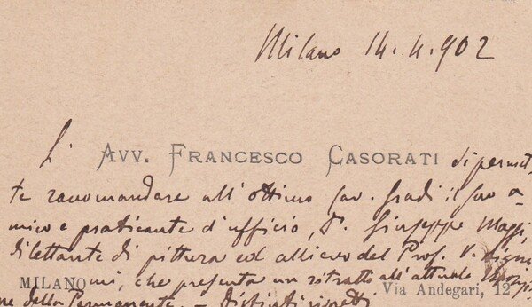 *Avv. Francesco Casorati - Milano. Biglietto da visita manoscritto 1902.
