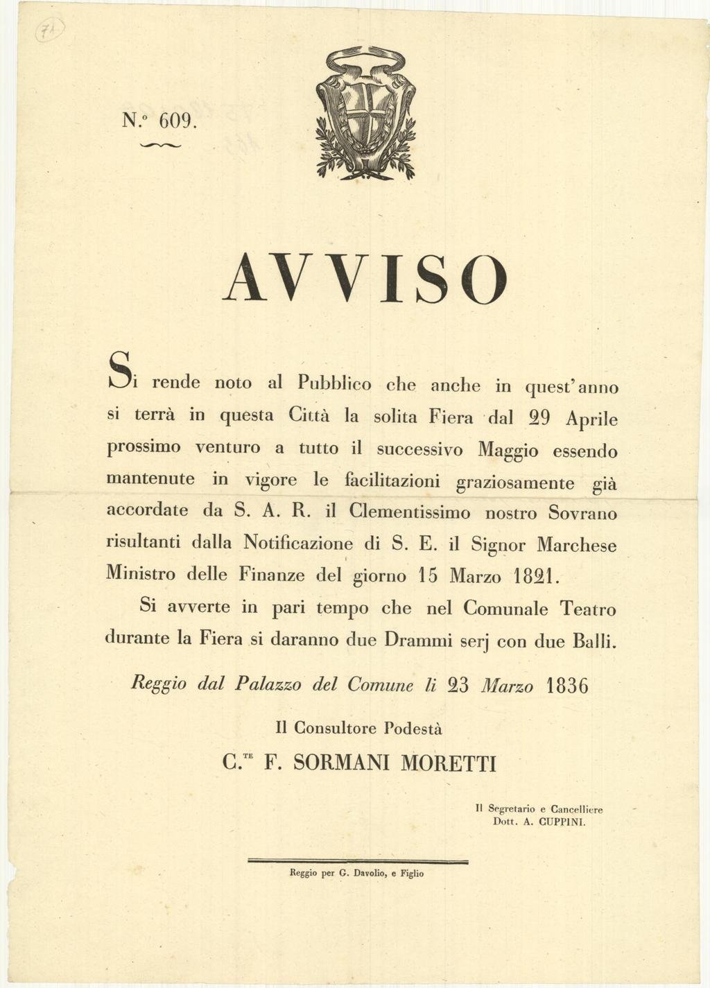 Documento, antico ed originale proveniente da importante collezione reggiana, in cui viene scritto “Si rende noto al Pubblico che anche in quest’anno si terrà in questa Città la solita Fiera dal 29 Aprile prossimo venturo a tutto il successivo Maggio essendo mantenute in vigore le facilitazioni graziosamente già accordate da S. A. R. il Clementissimo nostro Sovrano…” Reggio dal Palazzo del Comune li 23 Marzo 1836. Il Consultore Podestà C.te F. Sormani Moretti. Il Segretario e Cancelliere Dott. A. Cuppini – Reggio per G. Davolio, e Figlio