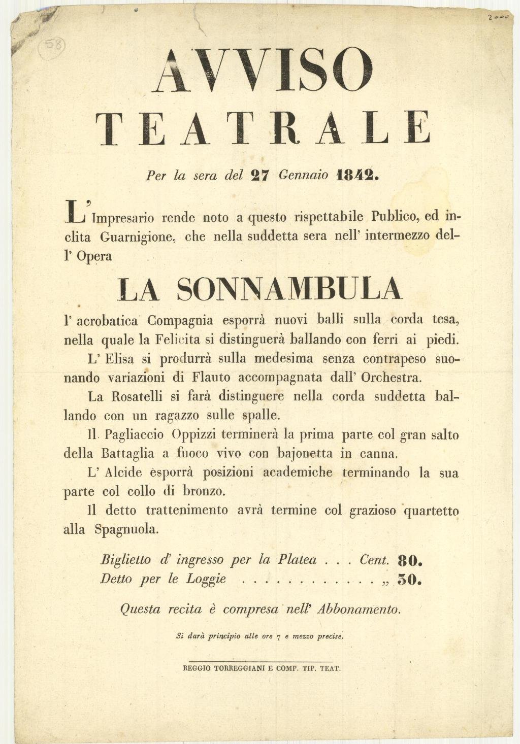 Documento, antico ed originale proveniente da importante collezione reggiana, dell'avviso alla popolazione che durante la sera del 27 gennaio 1842 “L’Impresario rende noto a questo rispettabile Publico, ed inclita Guarnigione, che nella suddetta sera nell’intermezzo dell’Opera ‘La Sonnambula’ l’acrobatica Compagnia esporrà nuovi balli…”