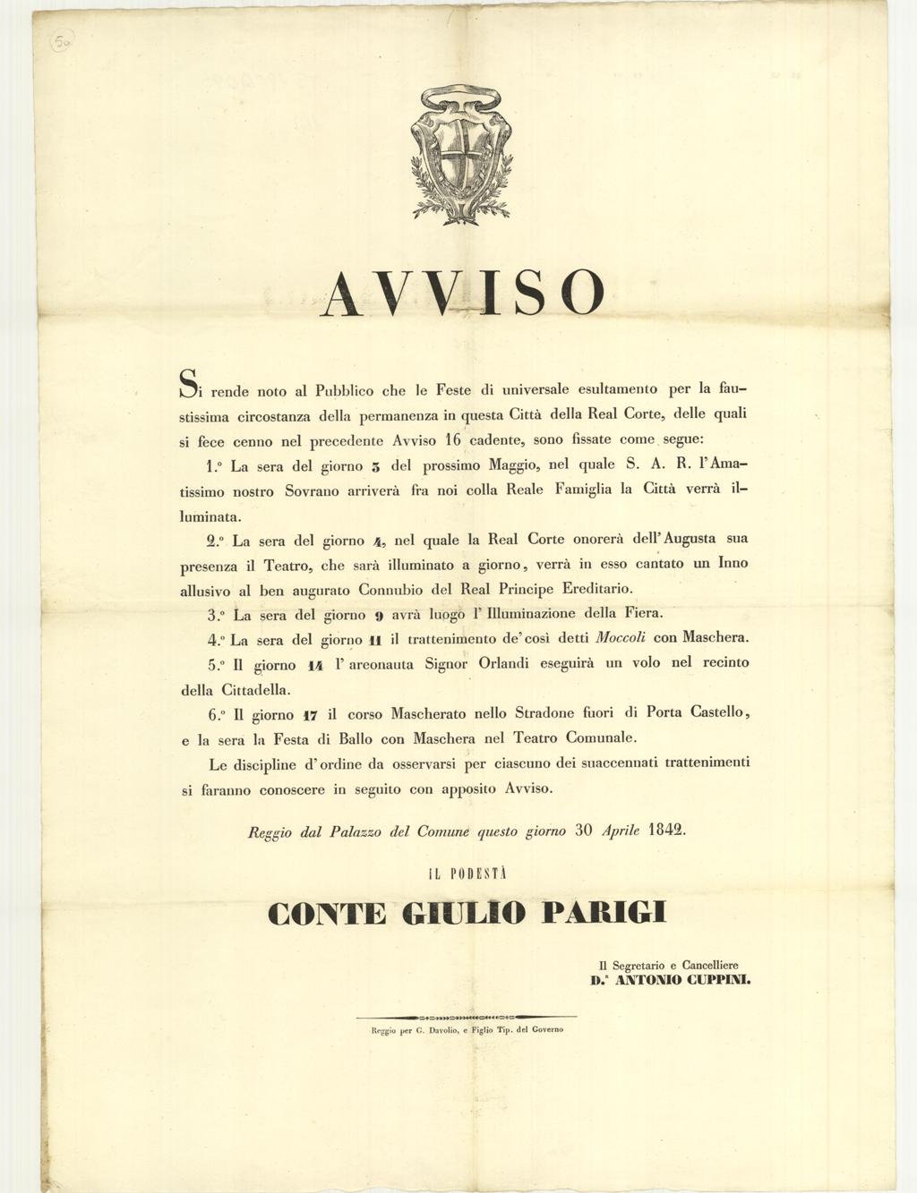 Documento, antico ed originale proveniente da importante collezione reggiana. Avviso del 30 aprile 1842 in cui si legge: Si rende noto al pubblico che le Feste di universale esultamento per la faustissima circostanza della permanenza in questa Città della Real Corte, delle quali si fece cenno nel precedente Avviso 16 cadente, sono fissate come segue:1° La sera del 3 del prossimo Maggio, nel quale S. A. R. l'Amatissimo Sovrano arriverà fra noi colla Reale Famiglia la Città verrà illuminata.2° La sera del giorno 4, nel quale la Real Corte onorerà dell'Augusta sua presenza il teatro, che sarà illuminato a giorno, verrà in esso cantato un inno allusivo al ben augurato Connubio del Real Principe Ereditario.3° La sera del giorno 9 avrà luogo l'Illuminazione della Fiera.4° La sera del giorno 11 il trattenumento de' così detti Moccoli con Maschera.5° Il Giorno 14 l'areonauta Signor Orlandi eseguirà un volo nel recinto della Cittadella.6° il giorno 17 il corso Mascherato dello Stradone fuori di Porta castello, e la sera la festa da Ballo con Maschera nel teatro Comunale.Le discipline d'ordine da osservarsi per ciascuno dei suaccennati trattenimenti si faranno conoscere in seguito con apposito Avviso.Reggio dal Palazzo del Comune questo giorno 30 Aprile 1842. Il Podestà - Conte Giulio Parigi. Il Segretario e Cancelliere D.r Antonio Cuppini.Reggio per G. Davolio, e Figlio Tip. del Governo