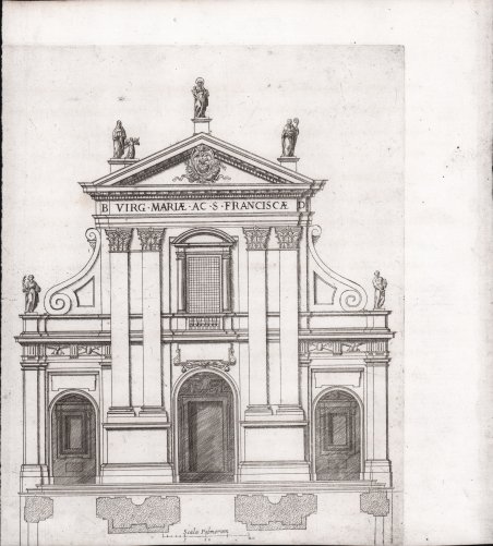 Facciata della ' Chiesa di Santa Francesca Romana. Acquaforte, stampata su carta vergata coeva, buone condizioni. Poco si sa di Regnard, se non che fu un incisore francese che trascorse gran parte della sua vita lavorativa a Roma realizzando belle incisioni dei magnifici edifici e delle antichità. Quest'opera di Regnard fu pubblicata a Roma da Francois Collignon nel 1650, senza titolo, ma in un insieme noto come ' Praecipua urbis templa. Le tavole mostrano prospetti, sezioni e piante di chiese romane del XVI e XVII secolo, con didascalie che le identificano e i loro architetti (con occasionali attribuzioni errate). Includono lavori di Carlo Maderno, G. della Porta, F. da Volterra, la famiglia Longhi, G.B. Soria e molti altri. Rara. Chiesa di Santa Francesca Romana Etching, printed on contemporary laid paper, good condition. Little is known about Regnard, except that he was a French engraver who spent much of his working life in Rome making fine engravings of the magnificent buildings and antiquities. This work by Regnard was published in Rome by Francois Collignon in 1650, without a title, but in a set known as ' Praecipua urbis templa. The plates show elevations, sections and plans of 16th- and 17th-century Roman churches, with captions identifying them and their architects (with occasional misattributions). They include work by Carlo Maderno, G. della Porta, F. da Volterra, the Longhi family, G.B. Soria and many others. Rare. Cfr.