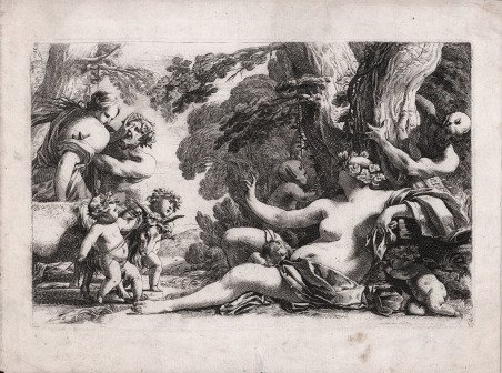 Acquaforte e bulino, 1650 circa, priva di firma. Questa tavola appartiene alla suite di ' Baccanalia ' descritte da Robert- Dusmenil (IV, 12-17) ' il cui frontespizio, inciso da Nicolas Cochin il Vecchio recita “Recueil de diverses Baccanales de Poussin, Chapperon, D’origny et autres”. Tutte le stampe della serie contengono gli indirizzi dei rispettivi editori ma non i nomi dei disegnatori e degli incisori, il che rende difficile attribuire definitivamente le opere ad artisti specifici. Le stampe furono probabilmente pubblicate per la prima volta dagli editori François Langlois, noto come 'il Ciartres' (1589 Chartres - 1647 Parigi), e Philippe Huart (attivo intorno al 1639-1648) e furono seguite da una seconda edizione pubblicata da Pierre Mariette. I disegni per le incisioni potrebbero provenire da Nicolas Chaperon o dallo stesso Dorigny. Sei tavole della suite, benché prive della firma dell’autore, per ragioni stilistiche, sono riconducibili a Dorigny, autore di un’altra suite di ' Baccanalia, composta anch’essa da sei lastre, tutte recanti la sua firma (Robert-Dusmenil, IV, 6-11). Incentrate sulle attività di Bacco, Sileno e la loro allegra compagnia, queste due serie di affascinanti composizioni all'acquaforte dimostrano la ricchezza e la destrezza dei poteri di invenzione di Dorigny. In contrasto con la maggior parte delle sue prime interpretazioni delle opere di Vouet e altri, dove spesso usava il bulino per aumentare leggermente la sua vigorosa acquaforte, alcune delle stampe successive di Dorigny, in particolare queste due suite di baccanali, si affidano ancora di più al bulino. Questa tendenza è parallela a un graduale cambiamento nel suo disegno, che rivela una crescente tendenza verso contorni pronunciati e figure più scultoree. Dopo essersi formato per cinque anni sotto Georges Lallemand a Parigi, Michel Dorigny si unisce presto alla cerchia del pittore Simon Vouet, con il quale stringe un'amicizia stretta e duratura. Dorigny divenne in seguito uno dei principali interpreti in campo tipografico dell'opera pittorica di Vouet e fu anche coinvolto come pittore in diversi progetti artistici del maestro. Le sue stampe comprendono opere su temi religiosi e mitologici così come stampe singole e serie su temi dionisiaci. Le suite probabilmente risalgono agli anni ’50 del XVII secolo, dopo la morte di Vouet. Bellissima prova, ricca di toni, impressa su carta vergata coeva, con margini, in ottimo stato di conservazione. Bibliografia Robert-Dusmenil, IV, p. 254, 14: Reed, ' French Prints from the Age of the Musketeers, p. 233. Etching and engraving, 1650 circa, numbered 11 at lower left. After training for five years under Georges Lallemand in Paris, Michel Dorigny soon joined the circle around the painter, Simon Vouet, with whom he struck up a close and lasting friendship. Dorigny subsequently became one of the main printmaking interpreters of Vouet’s painted oeuvre and was also involved as a painter in several of the master’s artistic projects. His prints include works on religious and mythological themes as well as individual prints and series on Dionysian topics. It is to this latter category that six etchings belong which Dorigny produced together with Nicolas Chaperon and other artists for the series entitled Recueil de diverses Bacchanales (Robert-Dumesnil, vol. IV, p. 254, nos. 12–17). All the prints in the series contain the addresses of the respective publishers but not the names of the designers and engravers, which makes it difficult to definitively ascribe the works to specific artists. The prints were probably first issued by the publishers François Langlois, known as ‘il Ciartres’ (1589 Chartres – 1647 Paris), and Philippe Huart (active around 1639–1648) and were followed by a second edition published by Pierre Mariette. The designs for the etchings may well stem from Nicolas Chaperon or from Dorigny himself. Another suite of six bacchanals (Robert – Dusmenil 6-11) bears on each plate the name of D’Origny as engraver. Both suites probably date to the 1650 when, after Vouet’s death, Dorigny became one of the most important decorative painters in Paris. Focused on the activities of Bacchus, Silenus, and their merry band of associates, these two etched sets of charming compositions demonstrate the wealth and dexterity of Dorigny's powers of invention. In contrast to most of his earlier interpretations of the works of Vouet and others, where he often used engraving to lightly augment his vigorous etching (see cat. 102), some of Dorigny's later prints, espe- cially these two suites of bacchanals, rely even more on engraving. This trend parallels a gradual shift in his draftsmanship, which reveals an increasing tendency towards pronounced contours and more sculptural figures. A fine impression, printed with tone on contemporary laid paper, with margins, very good condition. Bibliografia Robert-Dusmenil, IV, p. 254, 14: Reed, French Prints from the Age of the Musketeers, p. 233. Cfr.