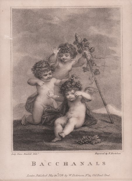 Bambini che giocano; un putto seduto a terra che spinge via un bambino che gli tira i capelli, guardato da un terzo bambino che sta dietro con il braccio destro alzato e tiene un bastone nella sinistra, tutti e tre indossano corone floreali, un grappolo d'uva giace in primo piano. Da un disegno di Lady Diana Beauclerk. ' Acquaforte e puntinato, 1791, con indicazione della produzione e della pubblicazione sotto l'immagine: "Lady Diana Beauclerk Delint. / Engraved by F. Bartolozzi / London, Published May 20th, 1791 by W. Dickinson, No, 24. Old Bond Street." Francesco Bartolozzi, figlio di un orafo fiorentino, conosce l'incisore tedesco Joseph Wagner presso la cui bottega, la più importante di Venezia, dove si trasferisce nell'agosto del 1748. Nella città lagunare Bartolozzi rimane per sedici anni, partecipando alla vita artistica ed entrando in contatto i maggiori editori e stampatori, oltreché con uomini di cultura. Alterna opere proprie a traduzioni da altri artisti in collaborazione con Wagner, come la serie dedicata al Guercino alla quale si dedica quasi esclusivamente fra il 1761 ed il 1765. Sono questi gli anni in cui Bartolozzi diviene titolare di una propria bottega. Si trasferisce quindi in Inghilterra, dove si ferma per circa quarant'anni, e dove si dedica prevalentemente all'attività di traduzione, alternando con eguale successo l'interpretazione delle opere dei pittori celebri del passato e quella dei contemporanei. Oltre ai disegni del Guercino della collezione reale l'artista riproduce disegni dai Carracci, Pietro da Cortona, Guido Reni, Carlo Maratta e dell’amico Giovan Battista Cipriani. Buona prova, impressa su carta vergata coeva, rifilata al rame, in buono stato di conservazione. Bibliografia Calabi & De Vesme, ' Francesco Bartolozzi. Catalogue des estampes et notice biographique d'après les manuscrits de A. De Vesme entièrement réformés et complétés d'une étude critique par A. Calabi n. 1252.IV. Children at play; a putto sitting on the ground, pushing away a young boy who pulls his hair, watched by a third child who stands behind with his right arm raised and holding a staff in his left, all three wearing floral crowns, a bunch of grapes lying in the foreground; after Lady Diana Beauclerk. Etching and stipple, 1791, lettered below image with production and publication detail: "Lady Diana Beauclerk Delint. / Engraved by F. Bartolozzi / London, Published May 20th, 1791 by W. Dickinson, No, 24. Old Bond Street." Francesco Bartolozzi, the son of a Florentine goldsmith, met German engraver Joseph Wagner at whose workshop, the most important in Venice, where he moved in August 1748. In the lagoon city Bartolozzi remained for sixteen years, participating in artistic life and coming into contact with major publishers and printers, as well as men of culture. He alternated between his own works and translations by other artists in collaboration with Wagner, such as the series devoted to Guercino to which he devoted himself almost exclusively between 1761 and 1765. These are the years when Bartolozzi becomes the owner of his own workshop. He then moved to England, where he stayed for about forty years, and where he devoted himself mainly to the activity of translation, alternating with equal success between interpreting the works of famous painters of the past and those of his contemporaries. In addition to drawings by Guercino in the royal collection, the artist reproduced drawings by the Carracci, Pietro da Cortona, Guido Reni, Carlo Maratta, and his friend Giovan Battista Cipriani. A good impression, printed on contemporary paper, trimmed to the platemark, good condition. Bibliografia Calabi & De Vesme, ' Francesco Bartolozzi. Catalogue des estampes et notice biographique d'après les manuscrits de A. De Vesme entièrement réformés et complétés d'une étude critique par A. Calabi n. 1252.IV. Cfr.