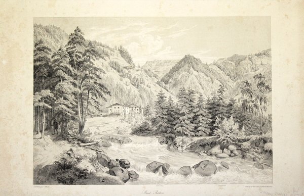 Litografia, 295x420. Bella veduta della località termale ai piedi dello Sciliar. Ottimo esemplare.