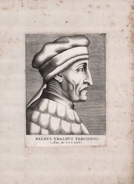 Ritratto del giurista Baldo degli Ubaldi (Perugia 1319 o 1327 - Pavia 1400). Discepolo di Bartolo da Sassoferrato, dominò tutti i campi del diritto: fu canonista oltre che civilista, e lasciò ampi commentari a tutto il Corpus iuris civilis e alle Decretali di Gregorio IX. Il ritratto appartiene alla famosa serie ' Illustrium iureconsultorum imagines quae inveniri potuerunt ad vivam effigiem expressae. Ex Musaeo Marci Mantuae Benavidij Patavini iureconsulti clarissimi ' pubblicata a Roma da Antonio Lafreri nel 1566. Si tratta di una importante raccolta di ritratti di 47 famosi avvocati italiani della collezione di Marco Mantova Benavides. Le prime 24 furono pubblicate nel 1566 da Antoine Lafréry; le restanti 23 furono pubblicate nel 1570 da Bolognino Zaltieri. Le tavole pubblicate da Lafréry sono attribuite a Enea Vico per motivi stilistici e indiziari. Assomigliano a serie prodotte da Vico negli anni '40 del secolo ed è molto probabile che, come quelle, anche queste siano state incise alcuni anni prima della pubblicazione da parte di Lafreri nel 1566. Scrive Alessia Alberti: “Il frontespizio, anche qui architettonico, assume una precisa valenza allegorica e rinvia, tramite le figure di Fortezza (a sinistra, con una colonna), Giustizia (in alto, con spada e bilancia) e Prudenza (a destra, con specchio e serpente), al tema della virtù. A questo fanno seguito, senza soluzione di continuità, ventiquattro tavole calcografiche con le effigi a piena pagina dei giureconsulti organizzate secondo un criterio di tipo cronologico. L’attenzione è concentrata sui volti e la sola componente testuale risiede nelle lapidarie didascalie poste nel margine inferiore, con il nome, in qualche caso la provenienza, seguiti dalla data del floruit e dal numero della tavola. Questo taglio della pagina contribuisce a conferire alla serie un’apprezzabile uniformità, malgrado l’eterogeneità dei modelli – probabilmente dipinti, a loro volta ispirati a svariate fonti in pittura, scultura, medaglie – che a quel tempo erano conservati nella collezione privata dell’autore di questo libro, il giurista padovano Marco Mantova Benavides (1489-1582), e che successivamente sono andati dispersi. La scelta di non inserire anche testi tipografici è forse da leggere qui in relazione a un’opera sullo stesso argomento che Mantova Benavides aveva pubblicato qualche tempo prima, ' Epitoma Virorum Illustrium qui vel scripserunt, vel iurisprudentiam docuerunt in Scholis et quo tempore etiam floruerunt, ' Padova, Grazioso Percacino, 1555, una rassegna più ampia ma priva di corredo iconografico, di cui l’impressione lafreriana ha illustrato una selezione di personaggi. Restano ancora da definire i contorni del rapporto tra l’autore del libro Mantova Benavides e l’editore Lafréry. I loro nomi infatti risultano già in precedenza associati a un’incisione edita a Roma nel 1553 da Lafréry, raffigurante il colossale Ercole in scultura eretto da Bartolomeo Ammannati nel cortile del palazzo Mantova Benavides a Padova. È plausibile che il tramite e l’innesco per la collaborazione tra i due possa essere stato l’incisore Enea Vico – cui è attribuibile il bulino dell’Ercole Benavides –, che risulta legato tanto al collezionista padovano quanto a Lafréry. […] Dopo la morte di Lafréry i rami di questa serie sono stati assegnati a Stefano Duchet, che li ha ceduti nel 1581 a Paolo Graziani («27 Pezi de Jurij consulti»); sono stati quindi acquistati da Pietro De Nobili (1585), il cui nome compare sul frontespizio nelle edizioni tarde. Questa serie di ritratti ha conosciuto una fortuna immediata e sono diversi gli esempi che si contano di una recezione in pittura, nelle stampe e nell’editoria libraria”. Bulino, privo di firma ed indicazioni editoriali. Esemplare nel primo stato di due, avanti l’indirizzo di Pietro de Nobili. Magnifica prova, ricca di toni, impressa su carta vergata coeva, alcune ossidazioni, per il resto. The portrait belongs to the famous series ' Illustrium iureconsultorum imagines quae inveniri potuerunt ad vivam effigiem expressae. Ex Musaeo Marci Mantuae Benavidij Patavini iureconsulti clarissimi ' published in Rome by Antonio Lafreri in 1566, depicting 47 famous Italian lawyers from the collection of Marco Mantova Benavides. The first 24 were published in 1566 by Antoine Lafréry; the remaining 23 were published in 1570 by Bolognino Zaltieri. The plates published by Lafréry are attributed to Enea Vico on stylistic and circumstantial grounds. They resemble series produced by Vico in the 1540s and it is quite possible that, like those, these were also engraved some years before they were published by Lafréry. Alessia Alberti writes: "The frontispiece, also architectural here, takes on a precise allegorical value and refers, through the figures of Fortitude (on the left, with a column), Justice (above, with sword and scales) and Prudence (on the right, with mirror and snake), to the theme of virtue. This is followed seamlessly by twenty-four intaglio plates with full-page effigies of the jurists organized chronologically. The focus is on the faces and the only textual component resides in the lapidary captions placed in the lower margin, with the name, in some cases the provenance, followed by the date of the floruit and the number of the plate. This cutting of the page contributes to the series' appreciable uniformity, despite the heterogeneity of the models-probably paintings, themselves inspired by a variety of sources in painting, sculpture, and medals-which at that time were kept in the private collection of the author of this book, the Paduan jurist Marco Mantova Benavides (1489-1582), and which were subsequently dispersed. The decision not to include typographical texts as well is perhaps to be read here in relation to a work on the same subject that Mantua Benavides had published some time earlier, ' Epitoma Virorum Illustrium qui vel scripserunt, vel iurisprudentia