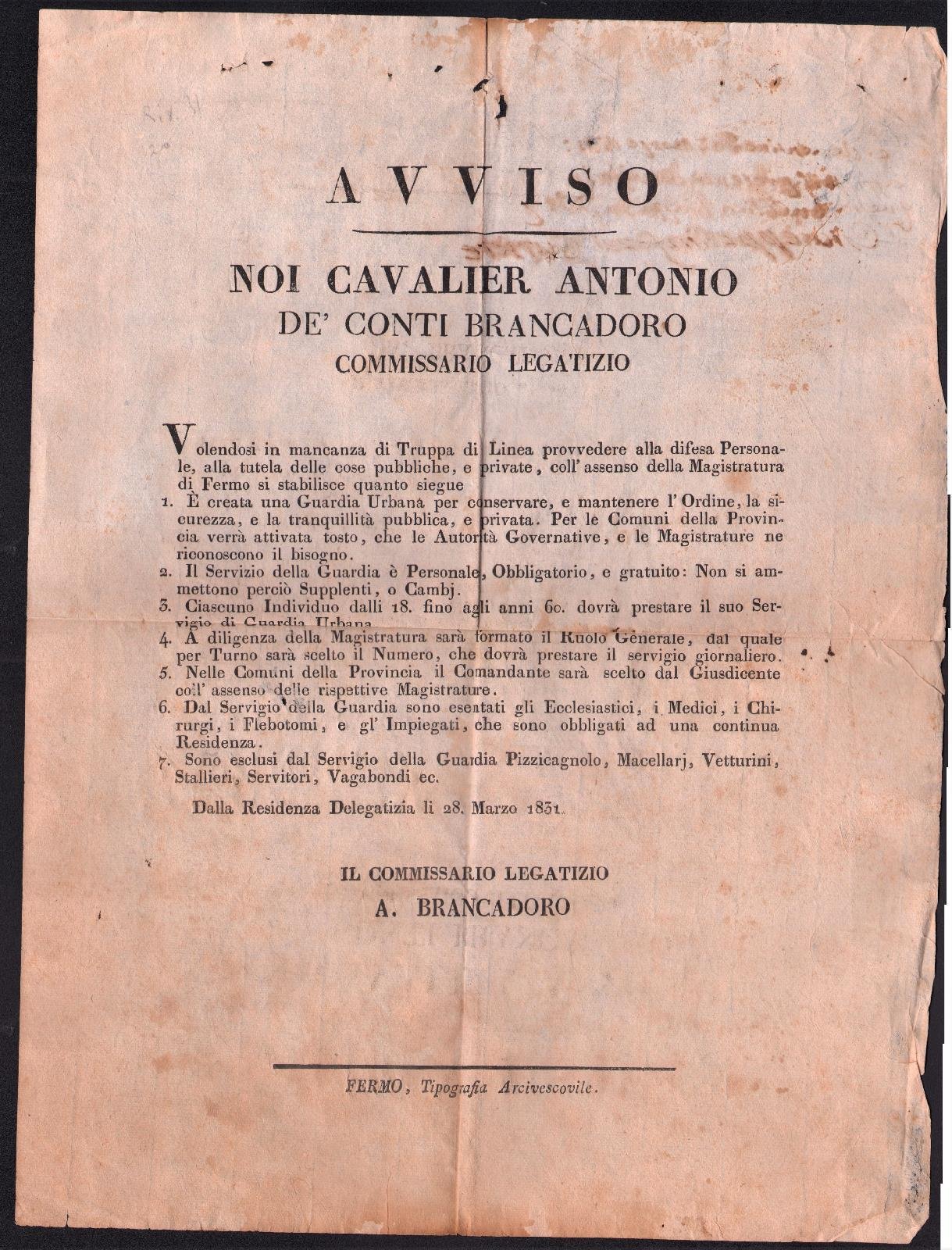 Bando del commissario legatizio Antonio Brancadoro. È creata una guardia urbana per conservare e mantenere l'ordine, ciascun individuo dai 18 e 60 anni dovrà prestare il suo servizio di guardia urbana. Interessante scritta coeva sul retro, " affisso il presente avviso in questa pubblica Piazza In fede Giuseppe Linfozzi cursore" 28 marzo 1831 cm. 42,5 x 32.