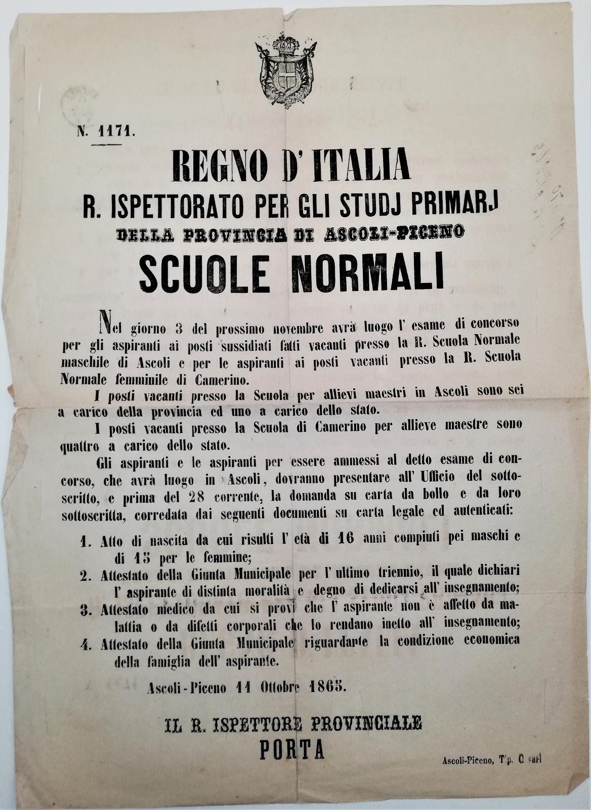 Bando Concorso per aspiranti maestri in Ascoli e a Camerino-Disinfestato 1865