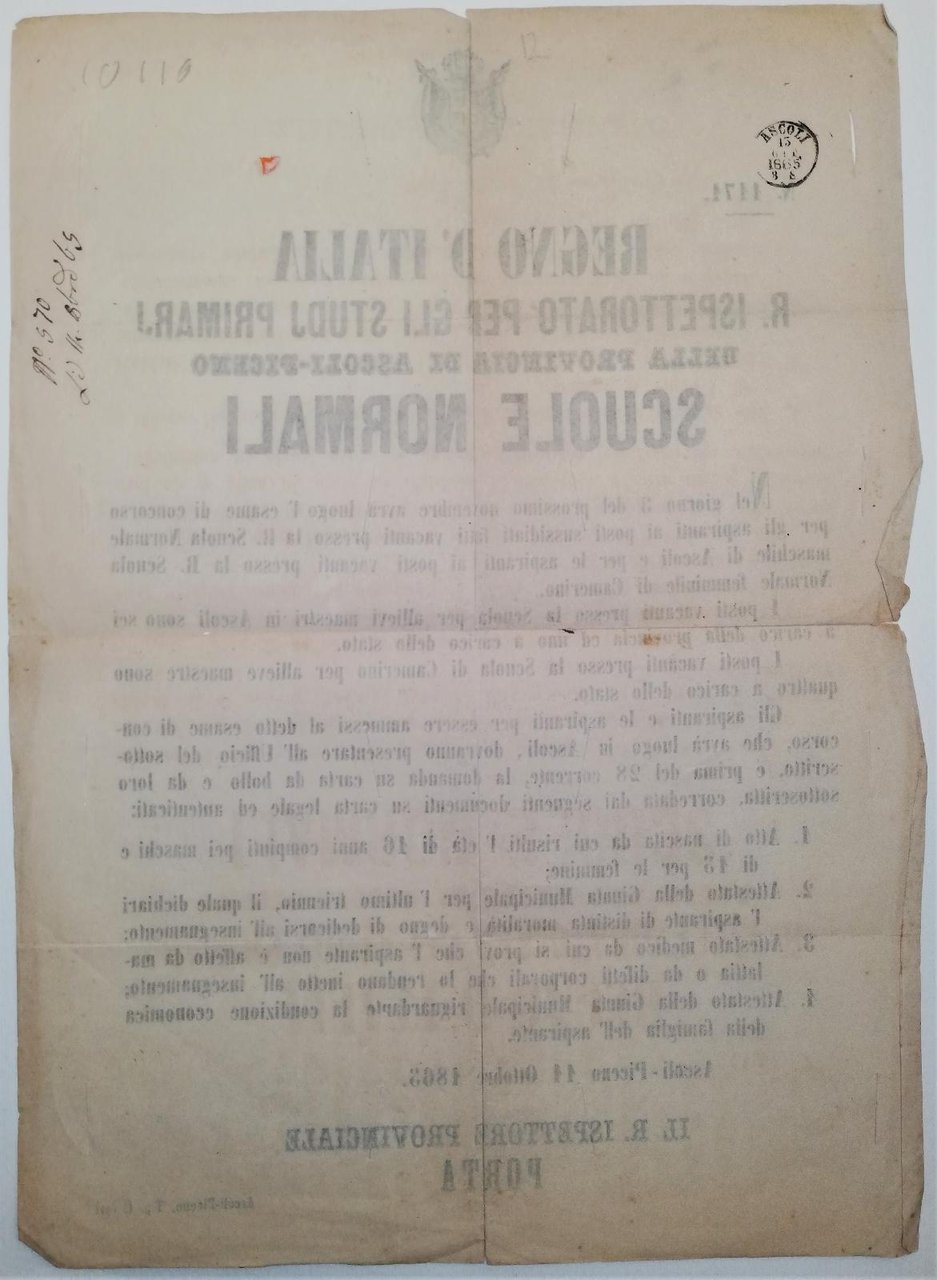 Bando Concorso per aspiranti maestri in Ascoli e a Camerino-Disinfestato 1865 cm. 41 x 30
