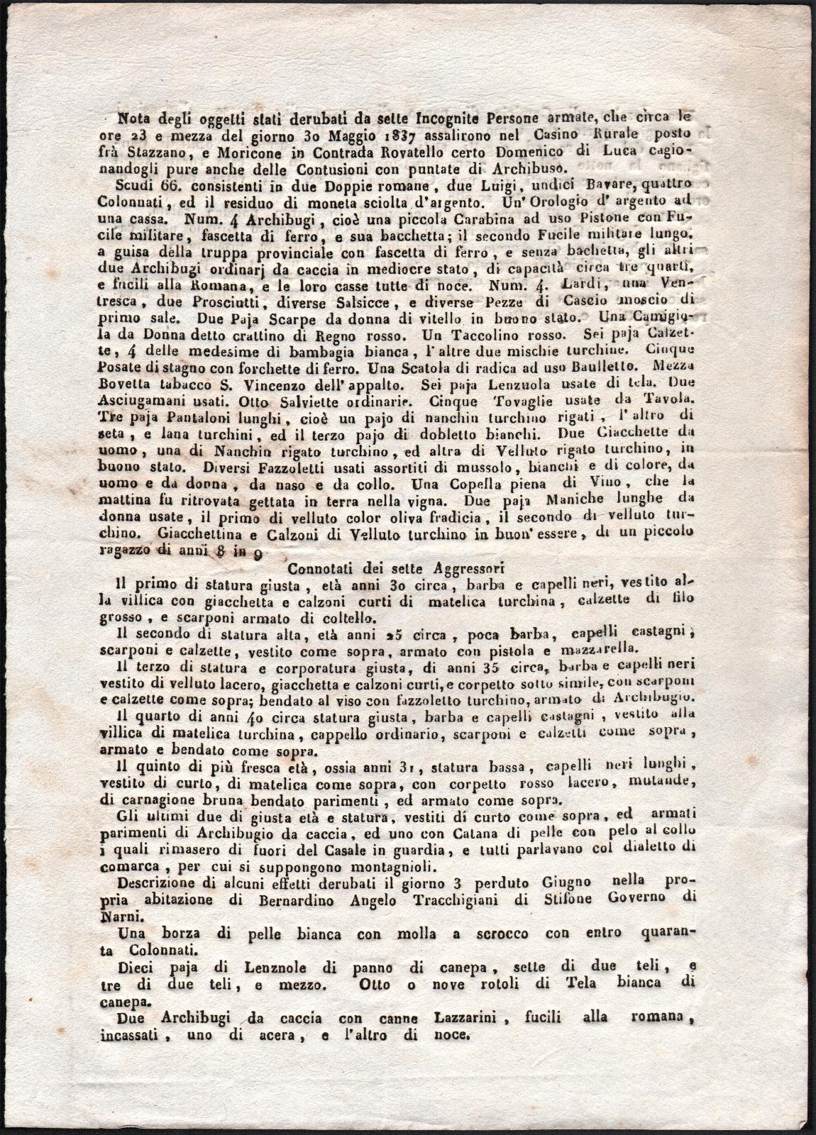 Bando-Furto tra Stazzano e Moricone (Roma) 1837 Elenco beni- connotati dei ladri