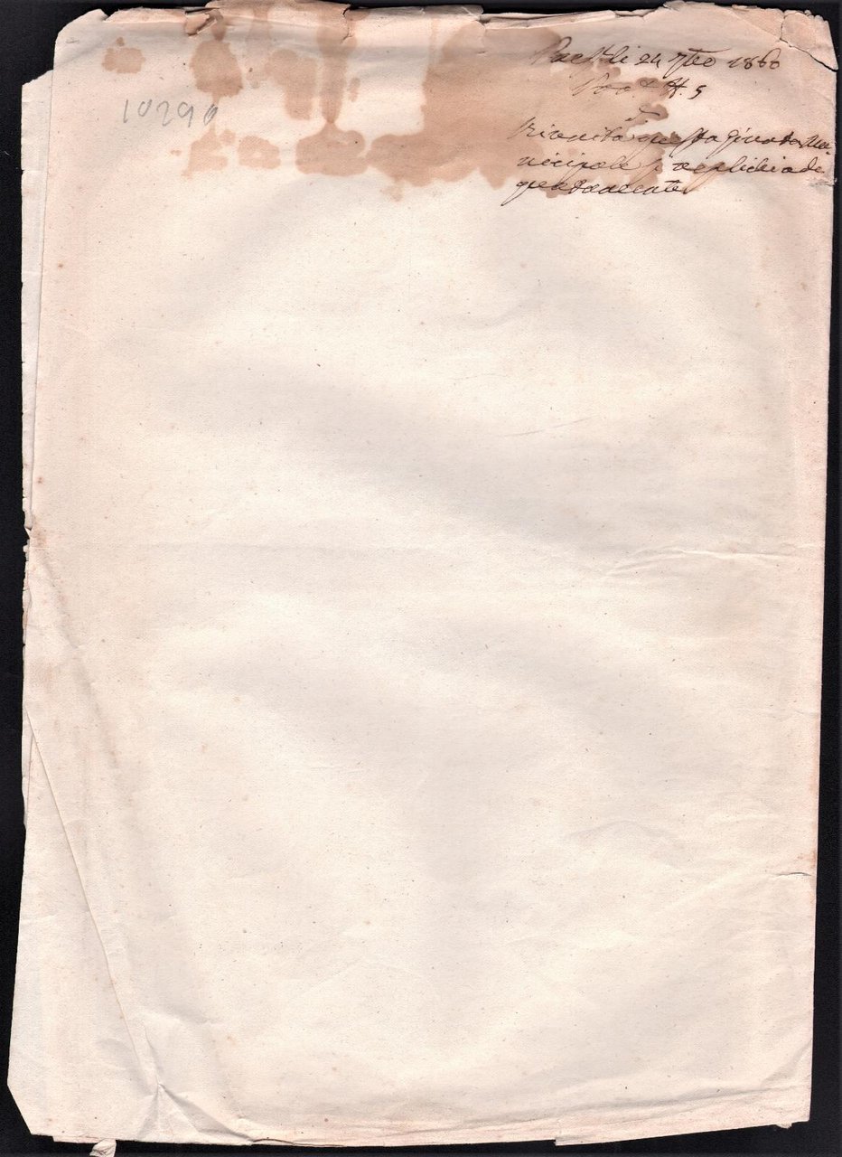 Quattro pagine, testo su una pagina grossa macchia al margine superiore della terza e quarta pagina bianca, una piega all'angolo destro inferiore della terza e quarta pagina. Foglio piegato più volte, in precarie condizioni molte pieghe, mancanze e strappi, soprattutto ai margini.