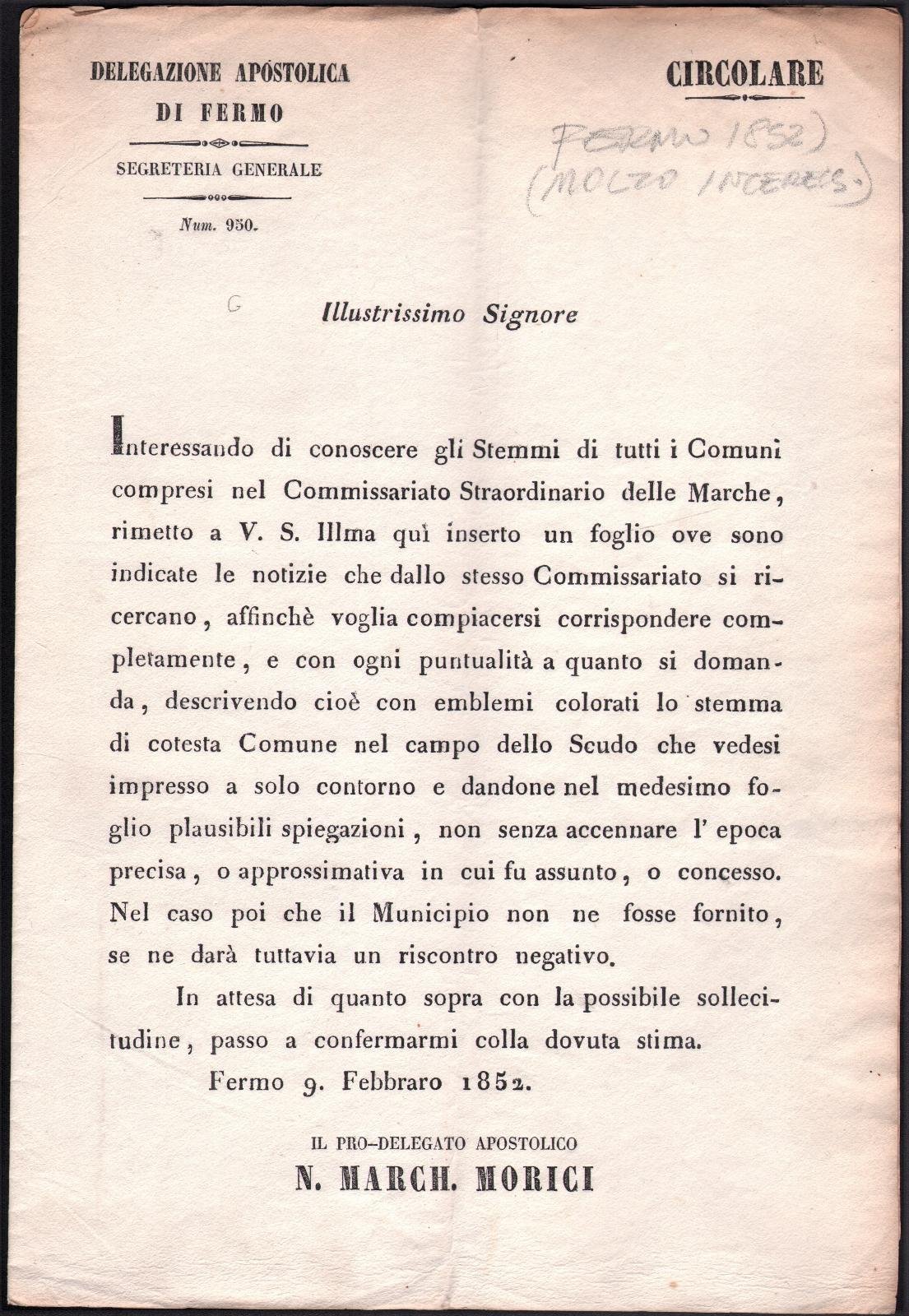 Bando Modulo da compilare per comunicare alla delegazione Apostolica gli stemmi di ogni comune Fermo 9 febbraio 1852 cm. 31 x 21