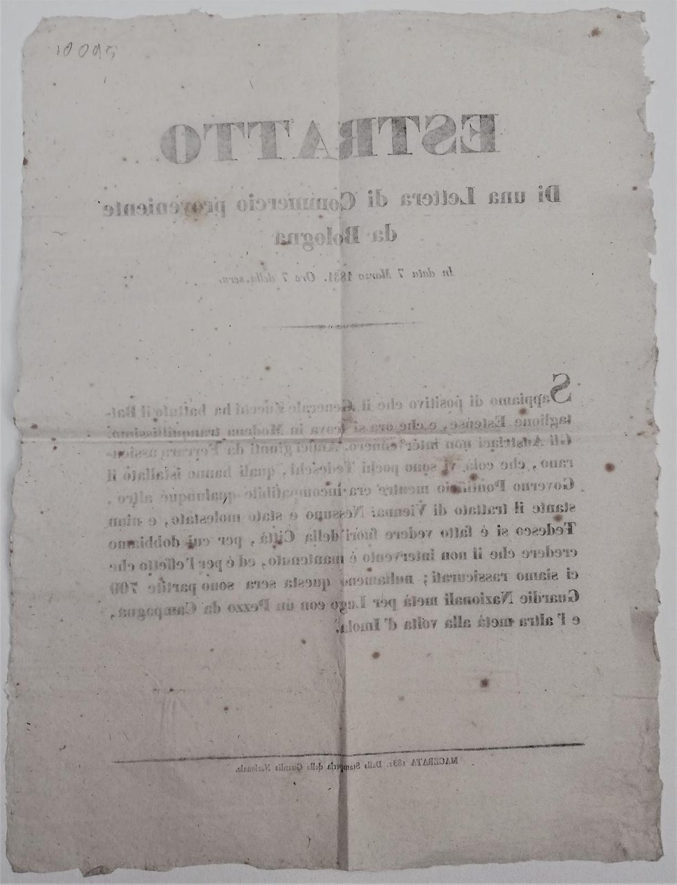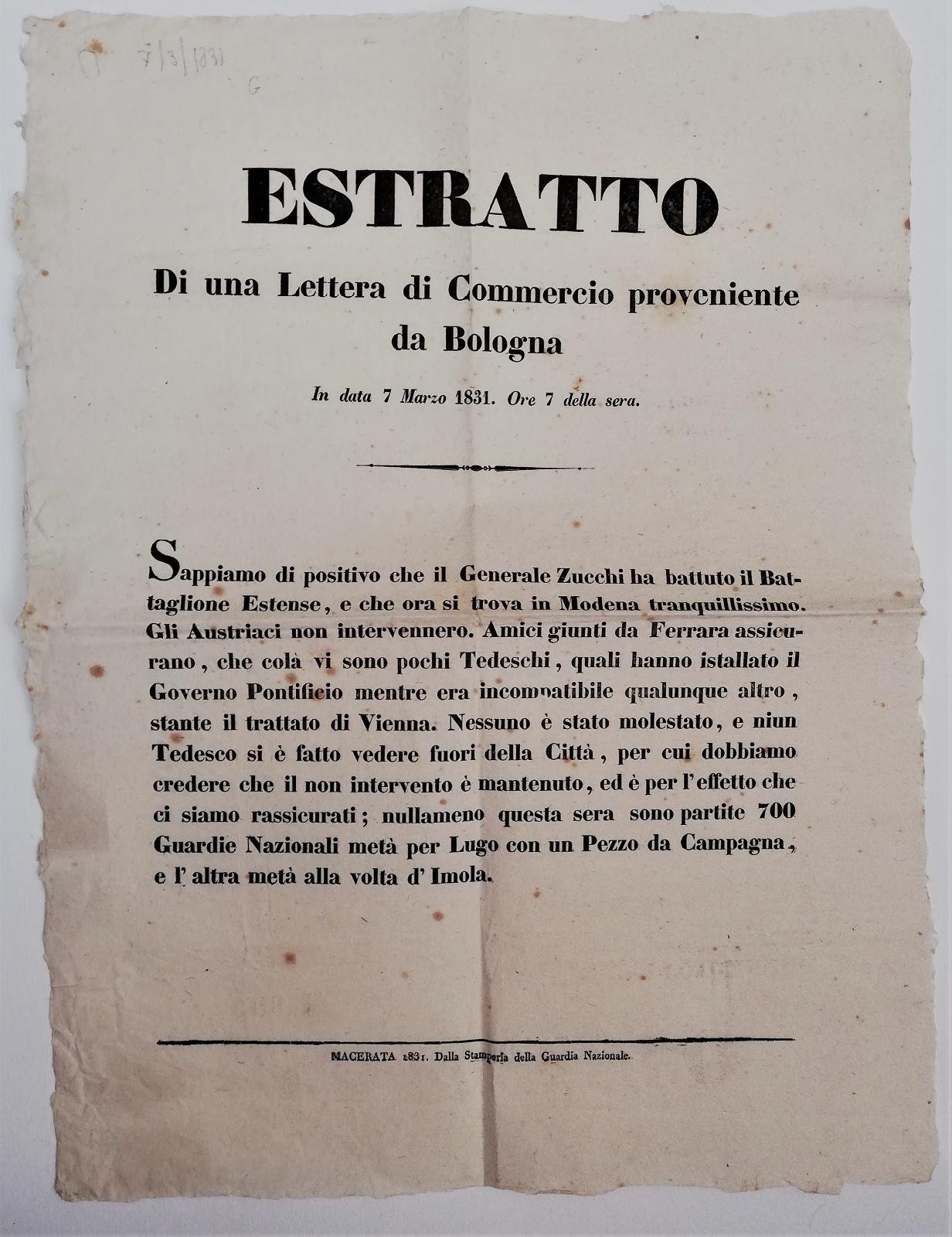 Il manifesto dichiara che generale Zucchi abbattuto il Battaglione Estense si trova a Modena ma in realtà il giorno dopo l'otto marzo 1831 sarà costretto a fuggire verso Bologna.