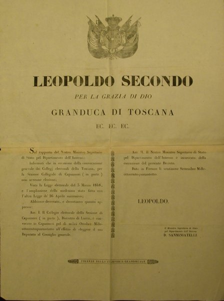Bando originale promulgato dal Ministro Segretario di Stato pel Dipartimento dell'Interno del Granducato di Toscana, Francesco Domenico Guerrazzi, con la convocazione del Collegio elettorale della Sezione di Carrara, Distretto di Massa Carrara.