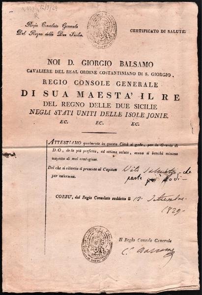 Bando Passaporto sanitario sanità marittima Regno delle due Sicilie Corfù 1829