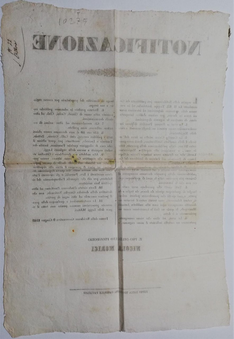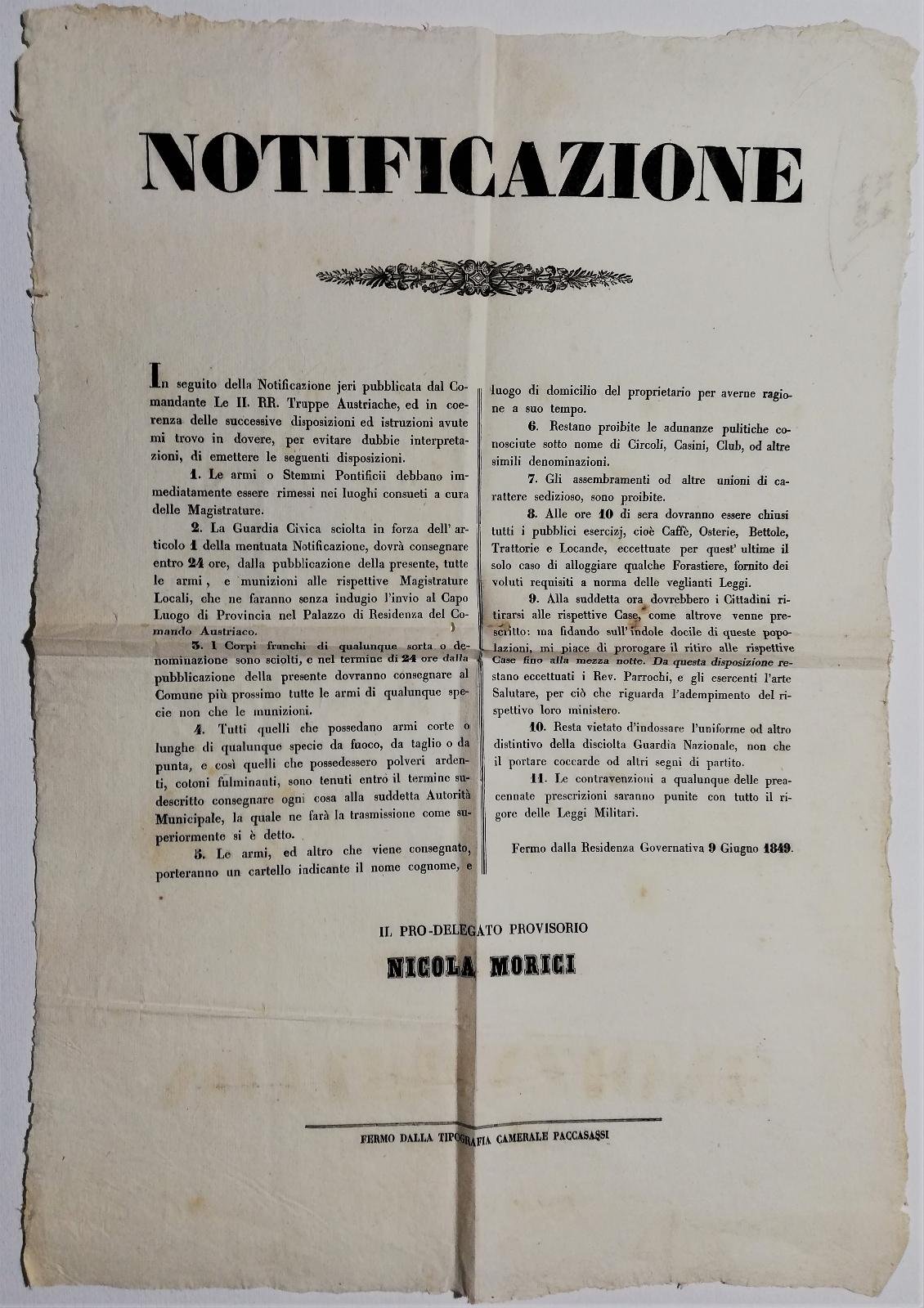 Bando Repubblica Romana Restaurazione Consegna delle armi e ordine di rimettere gli stemmi pontifici al loro posto 9 giugno 1849 cm. 54 x 39 Interessante manifesto datato fermo 9 giugno 1849, Con le disposizioni del restaurato governo pontificio