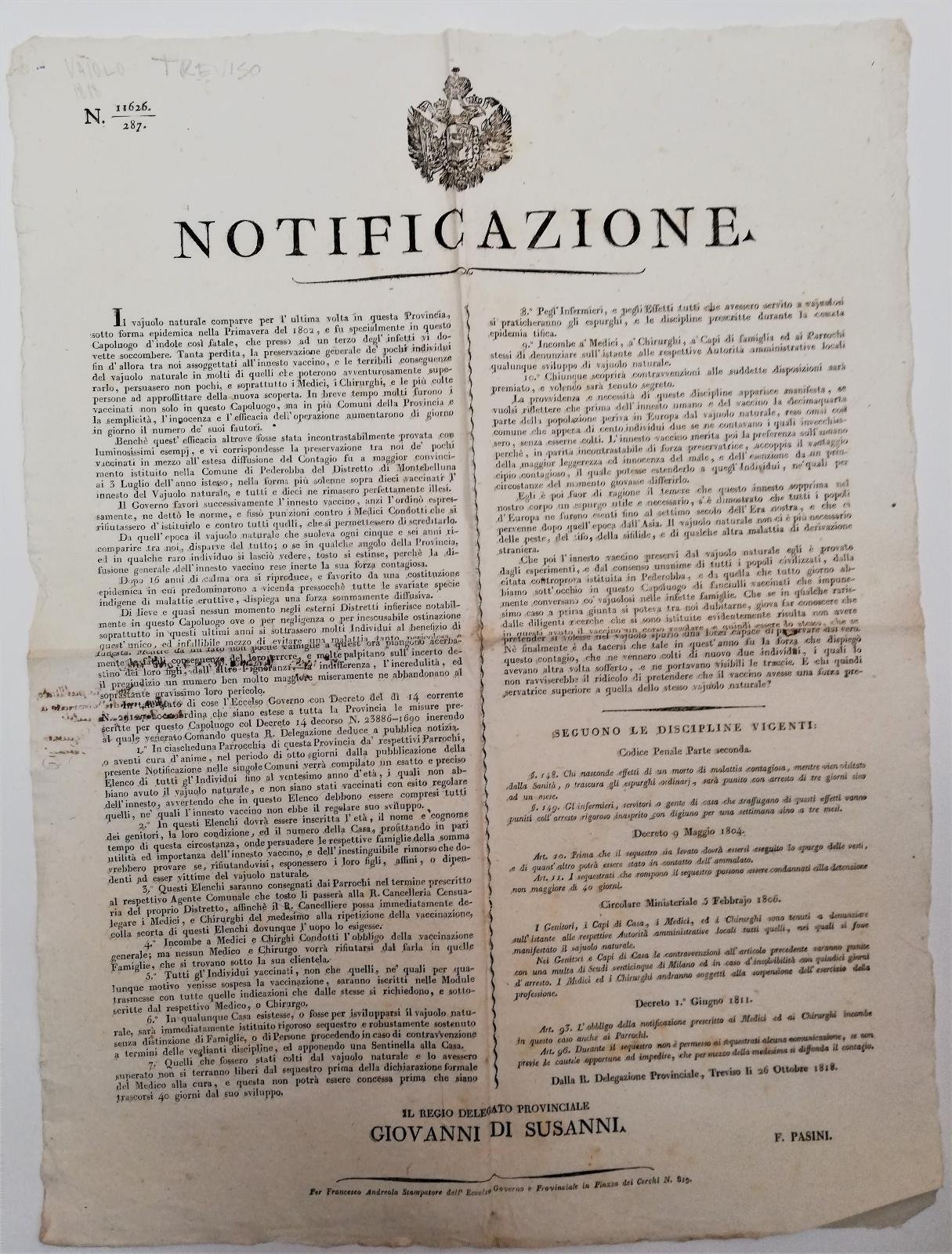 Il delegato Giovanni di Susanni ordina che in ciascuna parrocchia sia fatto un elenco di tutti gli individui fino al ventesimo anno di età che non abbiano avuto il vaiolo naturale. Il bando spiega che il vaiolo è ricomparso dopo 16 anni e nel 1802 a causa di questa epidemia un infetto su tre perse la vita.