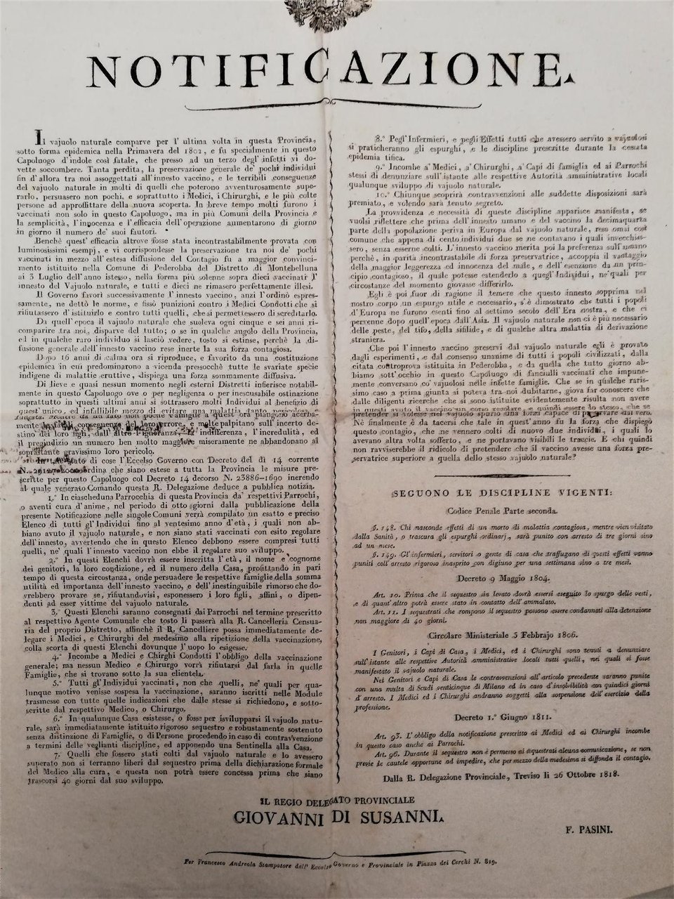 Bando-Sanità-Epidemia di vaiolo a Treviso dopo quella del 1802-26 ottobre 1818 cm. 61 x 46