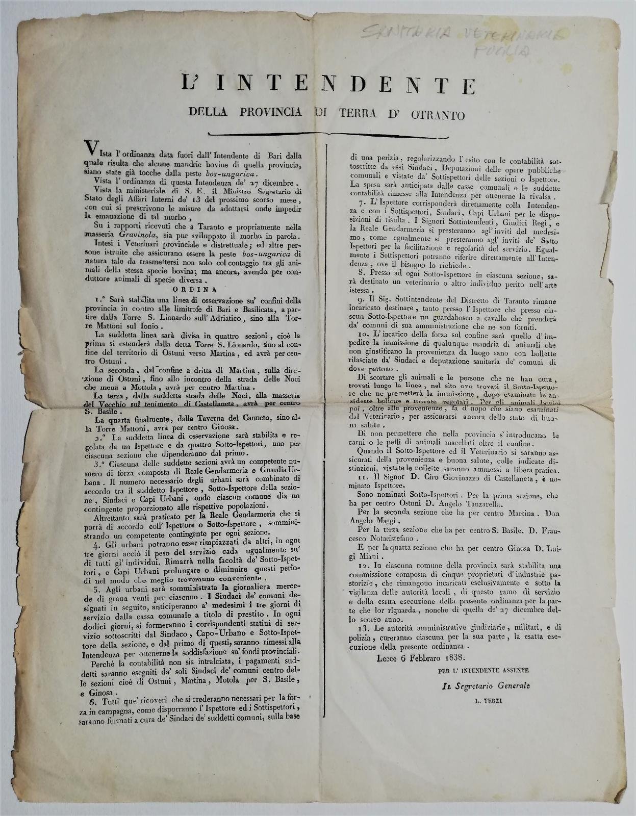 Bando sanità provincia di terra d'Otranto peste animale cordone sanitario 1838
