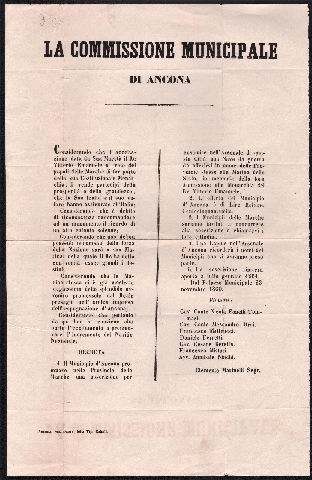 Bando sottoscrizione per costruire nell'arsenale di Ancona nave da guerra 1860