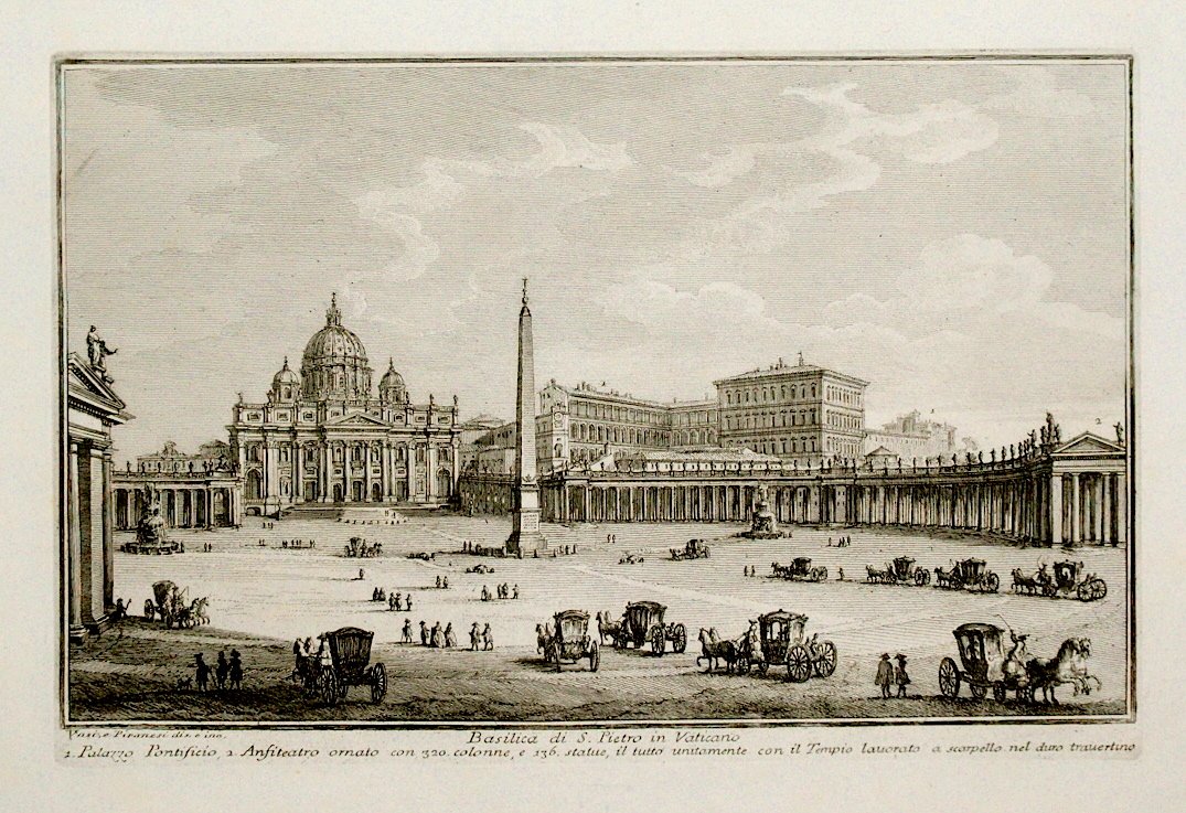 Incisione in rame, 215x325, probabile cooperazione fra i due grandi maestri nel periodo della giovinezza di Piranesi, raffigurante piazza S. Pietro con scena animata da cavalli e carozze in primo piano. Tratta da "Le magnificenze di Roma anticha e moderna ". Bell'esemplare marginoso, lievi tracce di sporco al margine.