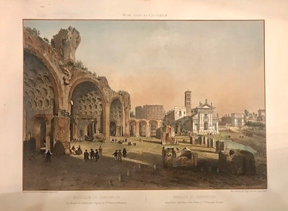 Litografia originale (cm. 36,5x25,5 più ampi margini bianchi) tratta dall’opera ‘Rome dans sa Grandeur’. Ottimo esemplare. Raffinata coloritura all’acquerello.
