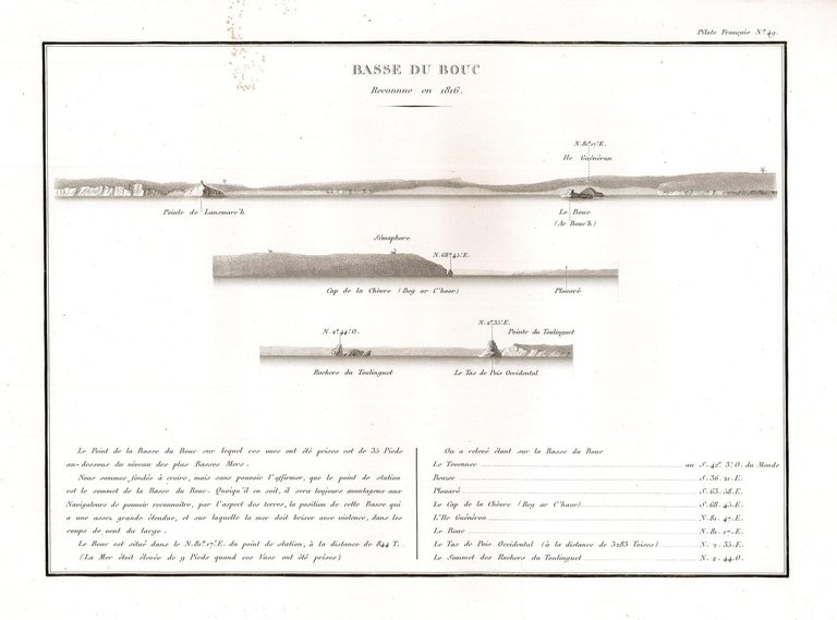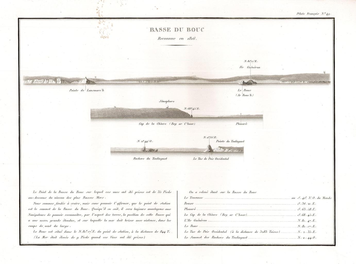 Incisione, antica ed originale, raffigurante le coste del nord-ovest della Francia nel litorale della Bretagna nei pressi di Brest in particolare: Pointe de Lansmare, Ile Guénéron, Cap de la Chèvre. Inserita nell’opera di Beautemps Beaupré Charles François (considerato il padre della idrografia moderna) “Pilote français, (environs de Brest) / Rédigé / Par M. Beautemps Beaupré Ingénieur Hydrographe en Chef de la Marine, / Membre de l’Académie Royale des Sciences de l’Institut de France… / Publié par ordre du Roi / Sous me Ministère de Son Excellence M.le Marquis de Clermont Tonnerre /.“ Edita a [Parigi]