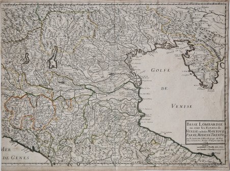 Carta geografica del nord-est della penisola, comprende l'Istria, il Golfo di Venezia, Genova e le regioni del Lago, focalizzandosi sui territori bagnati dal Po e su Venezia. Edita a Parigi nel "Carte Genèrales de Toutes le Parties du Monde". Questa edizione, pur presentando un proprio titolo ed essendo una carta a sé stante, era pensata per essere unita alla carta della "Lombardia" occidentale, a formare una unica grande carta della pianura padana.Perciò presenta nella parte sinistra della carta una sfumatura dell'incisione e non è chiusa dalla consueta cornice d'inquadramento. Sanson, geografo del Re Luigi XIII è considerato il fondatore della cartografia francese. Bell'esemplare con margine sinistro rifilato sulla cornice d'inquadramento. Incisione in rame, coloritura coeva dei contorni, in ottimo stato di conservazione. Scarce edition of Sanson's map of northeastern Italy, Istria and the top of the Gulf of Venice to Genoa and the Lake Regions, centeredon on the Po River and Venice.Map taken from "Cartes Gènerales de toutes les parties du Monde" by Sanson.The maps were compiled by Nicolas Sanson who published his atlas in 1654, with 100 maps, and printed by Pierre Mariette; they were issued progressively from 1630. Sanson was the most noted French cartographer in modern history. Mapmaker to Louis XIV, King of France, Sanson endowed his maps with the most recent geographical information as well as the finest and sharpest engraving of the period. His "Cartes Generales de Toutes les Parties du Monde" was the most important single product of French commercial cartography of the seventeenth century.Copperplate, good condition. Cfr.